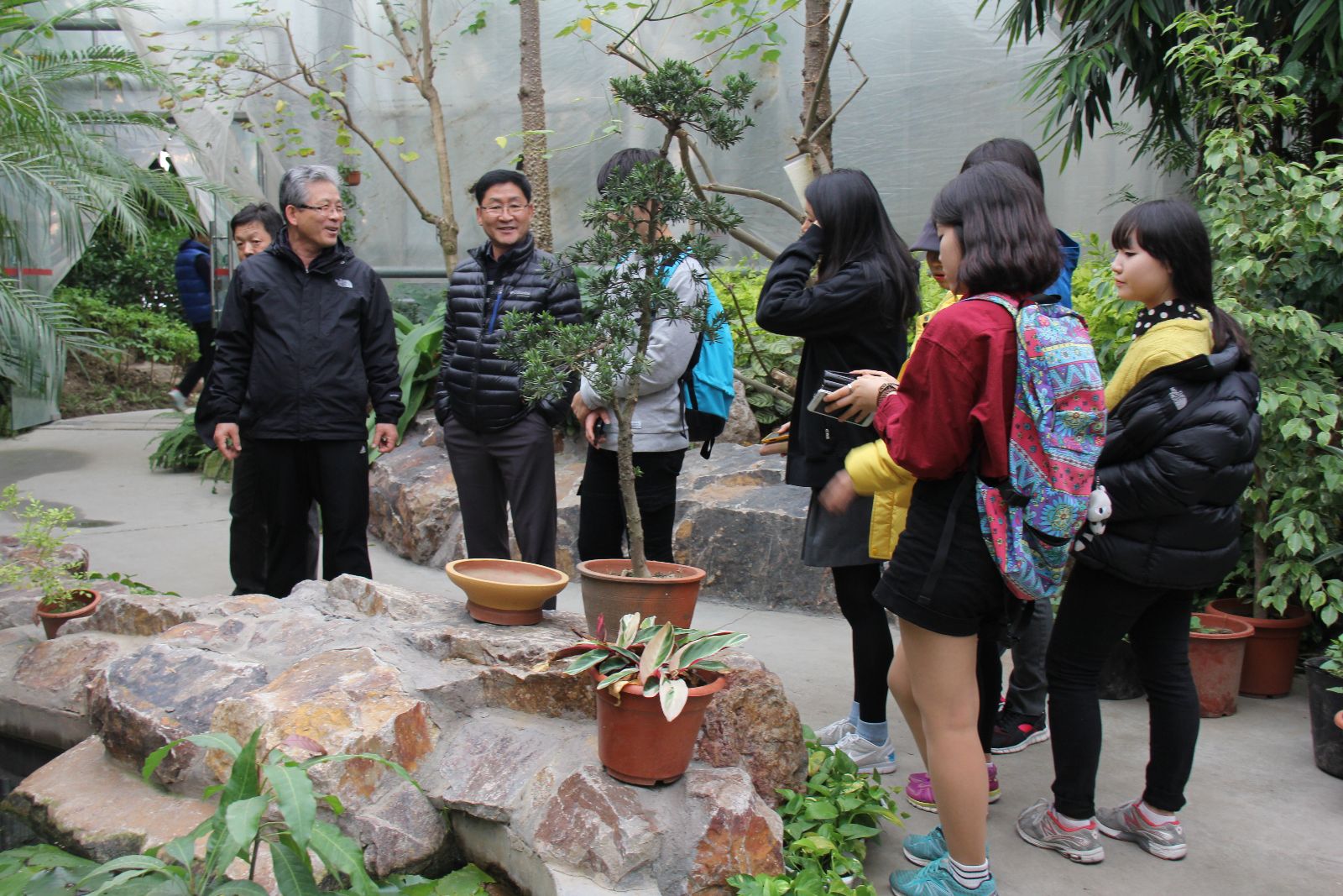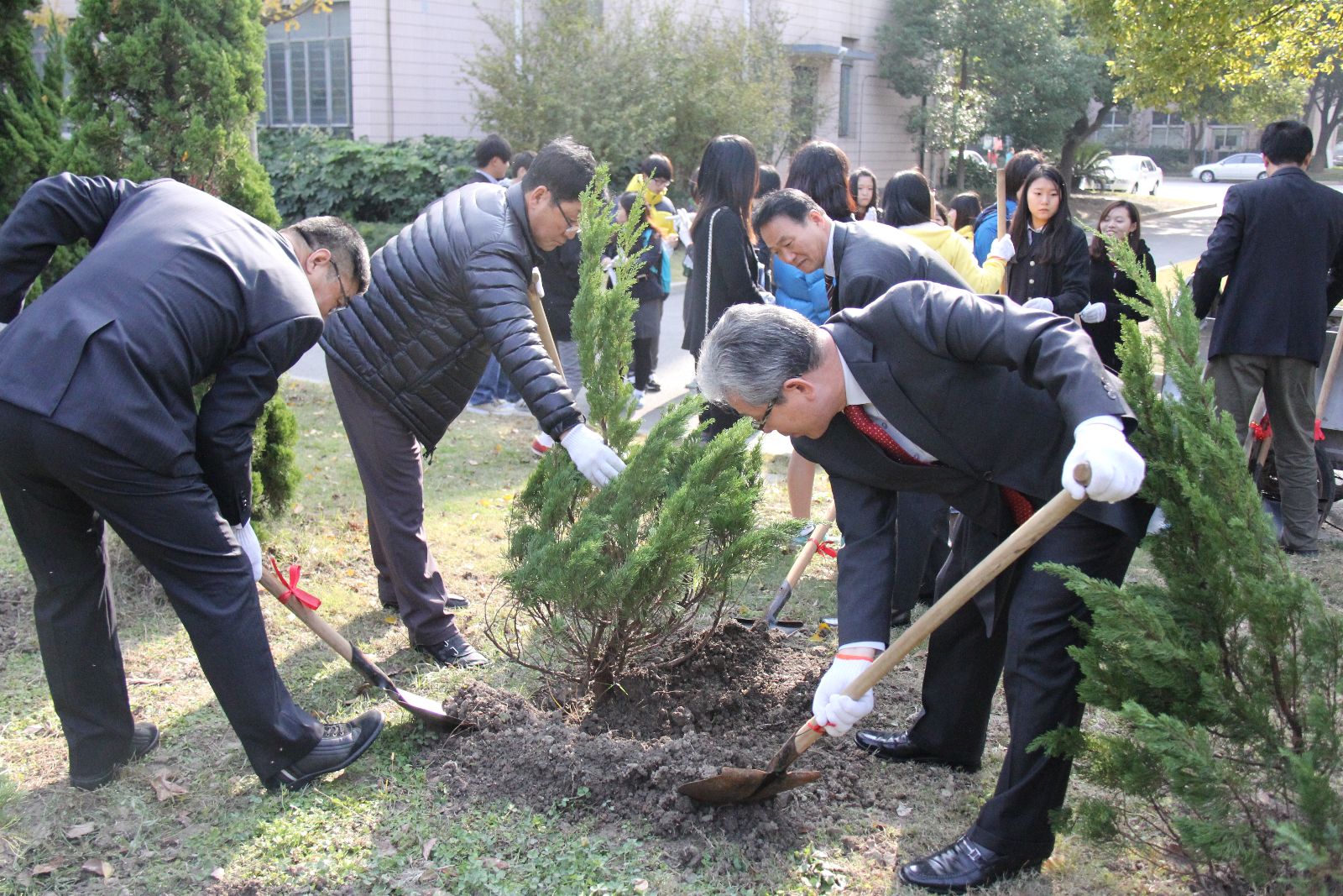 欢迎仪式结束后,韩方代表团师生参观了标本馆以及校园。两校师生代表来到学校体育馆东侧草坪上进行植树活动,在中韩友好纪念碑旁共同植下友谊之树。随后,韩方师生分组来到艺术插花教室和农家乐客房服务教学课堂进行观摩听课,与师生进行现场交流。