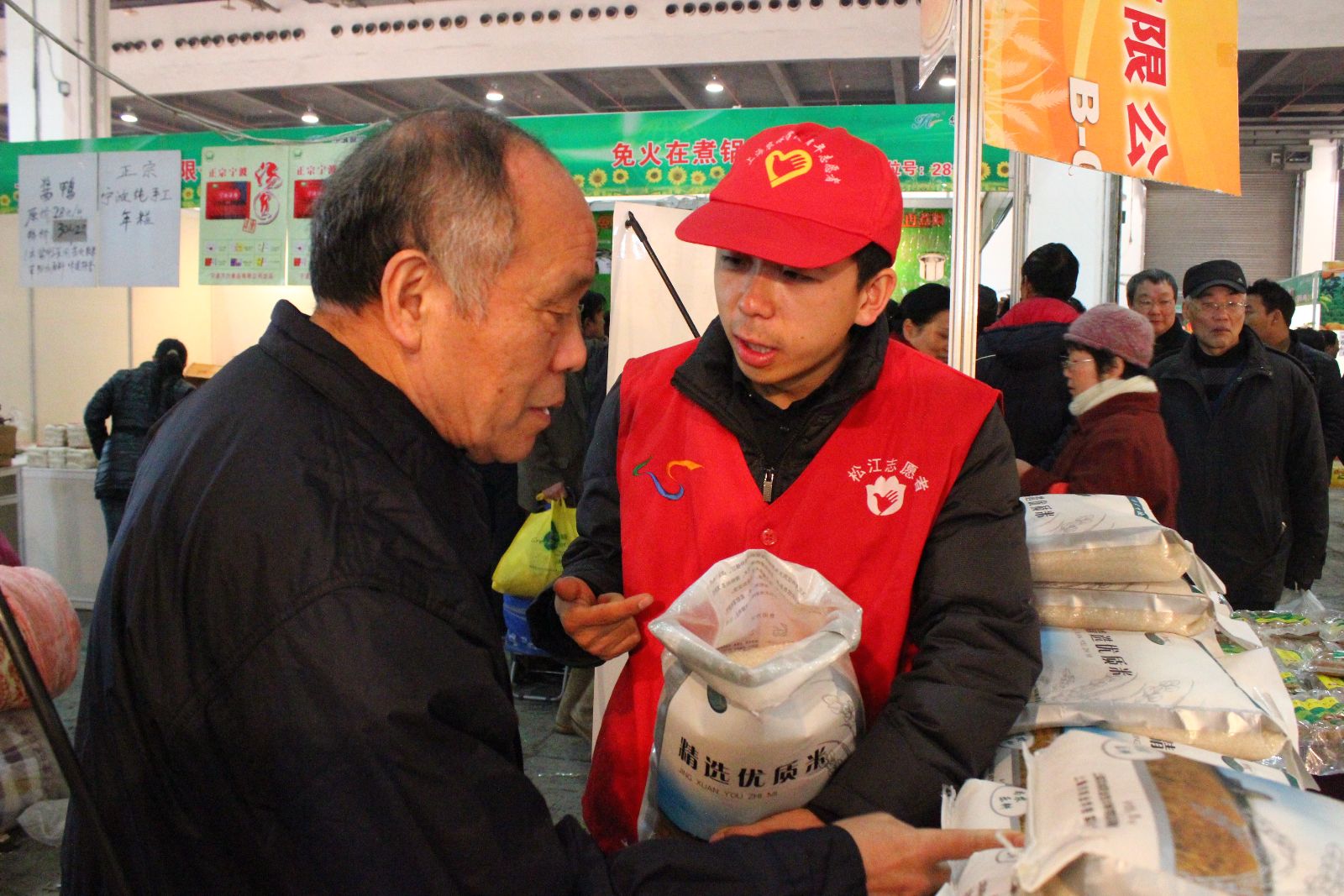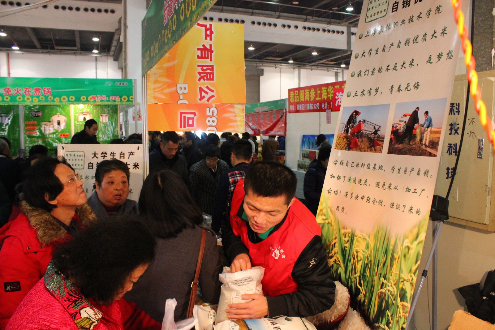 1月4日,上海光大会展中心举办的农博会上人头攒动,一群稚嫩的“学生脸”很特别,其中一个销售大米的展柜引起关注。只见一个大米展柜前一字排开十多名大学生,他们穿着统一的志愿服装,帽子上印着“上海农林职业技术学院”的字样,“阿姨、大爷、叔叔,大米3块钱一斤,是我们上海农林职业技术学院师生自产自销的,安全放心的原生态大米。”一名稚气未脱的大学生站在一袋袋堆积如山的大米前,向市民热情推销。这支特殊的营销队伍引来了众人围观,生意一笔接着一笔。