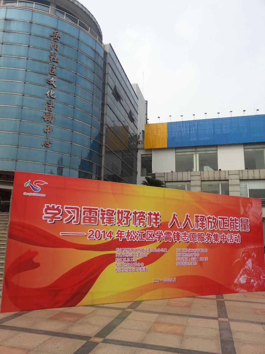 2014年是毛泽东同志“向雷锋同志学习”题词51周年。3月2日,松江岳阳社区文化活动中心的门前热闹异常。我院工会联合团委学生处在全院范围发起了学雷锋的号召,并共同参与了由松江区精神文明建设委员会、松江区总工会、共青团松江区委员会等多家单位联合举办的松江区学雷锋志愿服务集中活动。