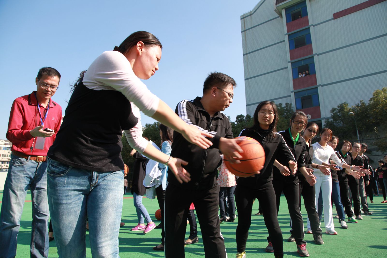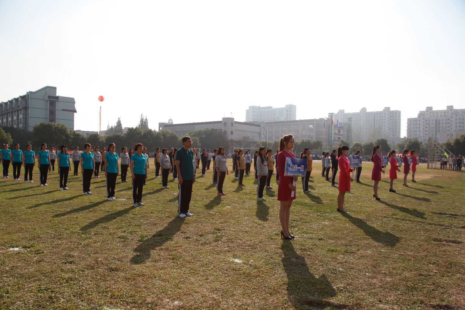 朝阳下教工的广播体操队伍