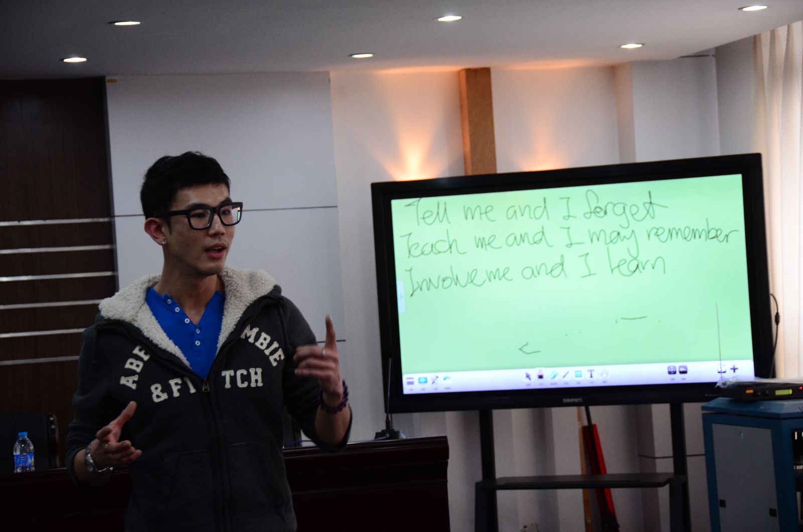 本次培训特别邀请了来自台湾地区的张杰宇老师为校内外老师做了“高效课堂管理艺术”的培训。张老师首先用富兰克林的名言展开话题,“告诉我,我会忘记;教给我,我可能记住;让我参与,我才能学会。”如何让学生踊跃参与课堂教学活动,这是我们在课前准备和教学进行中的关键问题。课堂提问和教学内容要避免无趣和结构混乱,而应该努力发掘课程的兴趣点。张老师富有激情和幽默的授课方式让培训现场气氛活跃,笑声掌声阵阵,好几位兼课教师和校内教师也踊跃走向前台,向同行分享他们所授课程的趣味话题。