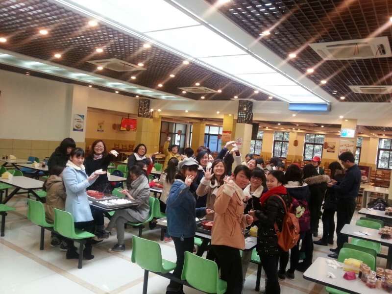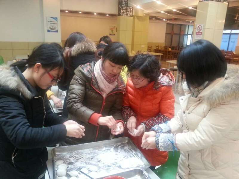 来自五湖四海的师生,分成几个组,很多心灵手巧的老师主动担当起教的任务,后勤的阿姨们也前来帮忙,大家有说有笑,热火朝天的和面包汤圆。