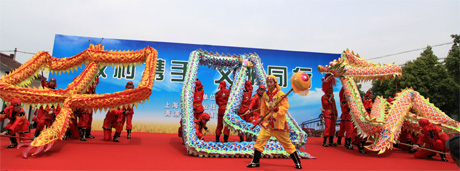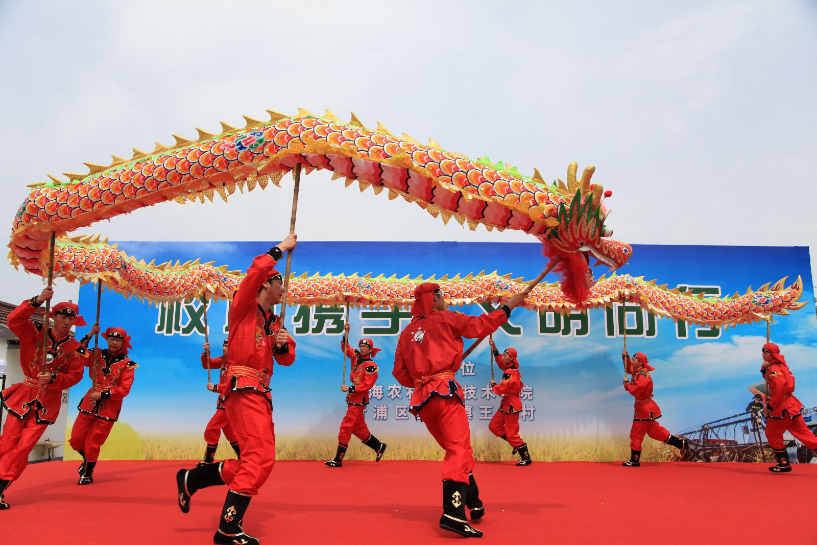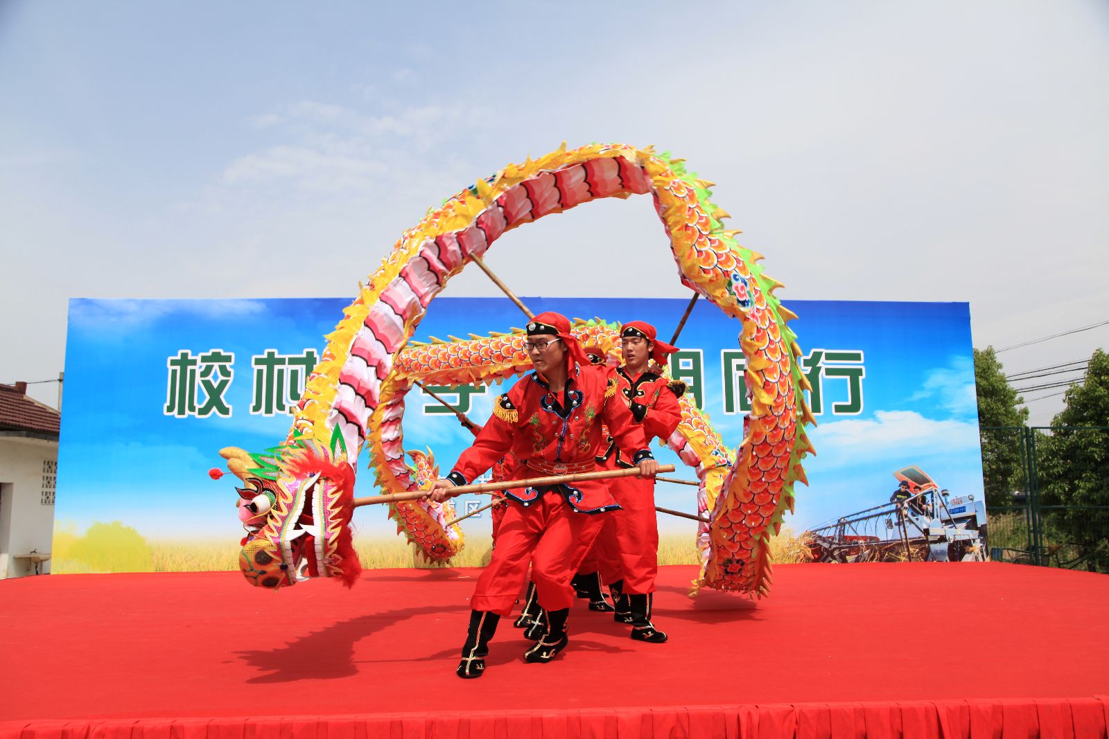 文艺演出开场,我院舞龙队首秀。长约10米的金色龙身在舞台上如波浪般连绵起伏,上下翻飞,舞龙队成员个个精气神十足。两分钟后蓝色、红色两条龙同时上台与金龙相会,随着音乐鼓点落下,三条龙摆出“中国龙”造型,气势恢宏,震撼全场。接着是大学生艺术团带来的适合乡村的节目,金泽镇文广中心表演的颇具地方特色的《采茶舞曲》和沪剧《寻娘记》等节目穿插其中,受到村民们喜爱。节目中间还穿插了结对共建、环保知识等有奖问答,村民们踊跃抢答,现场一片欢声笑语。