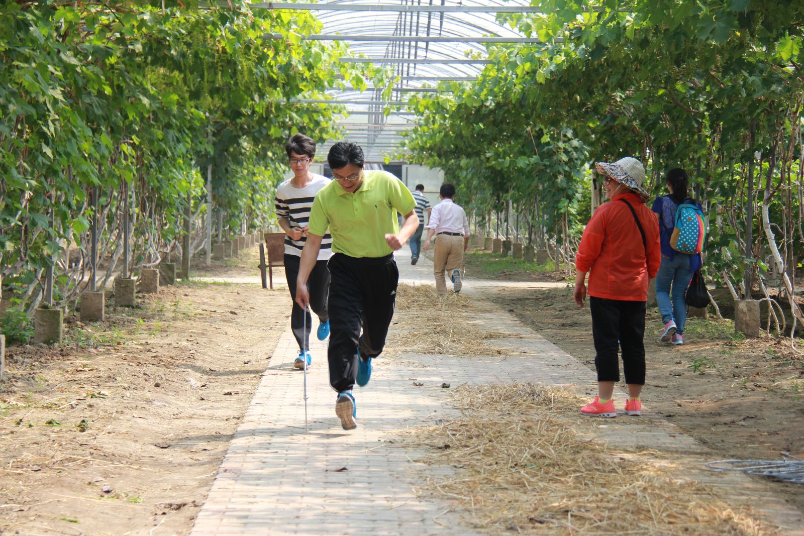 下午14:00,参赛小组成员整装待发,随着裁判的哨声响起,比赛正式开始。一路上,你追我赶,齐心协力,到达第一任务点,每人各选滚铁环、踢毽子、跳绳其中一项任务,任务完成后继续往前骑行,随后到达第二任务点,合力完成吊兰的翻盆工作,完成后继续骑车前进到达终点。比赛过程中,由于教职工的体力各不相同,大家互相鼓励,加油打气。为了取得比赛最好成绩,有的老师包揽了全部的翻盆工作。在美丽的实训基地上,阳光、绿荫下,阵阵田间的清新气息中,经过各小组通力合作的完美配合后,比赛在一片欢声笑语中结束。