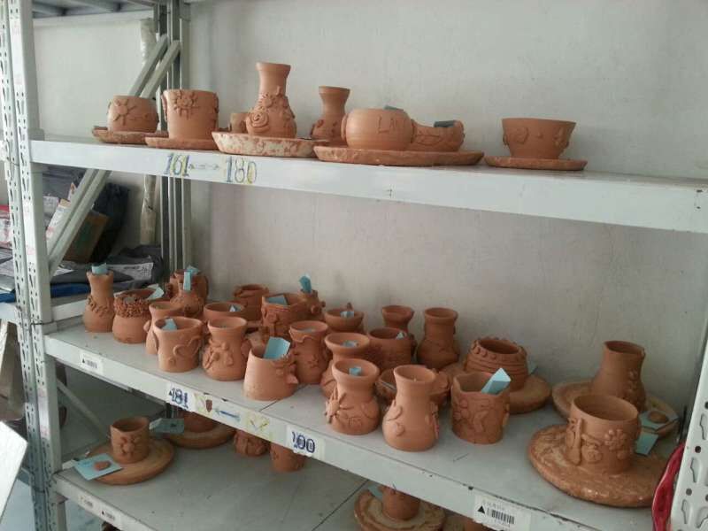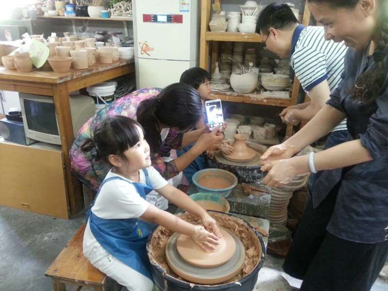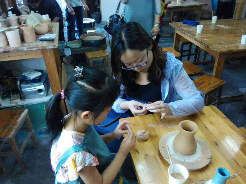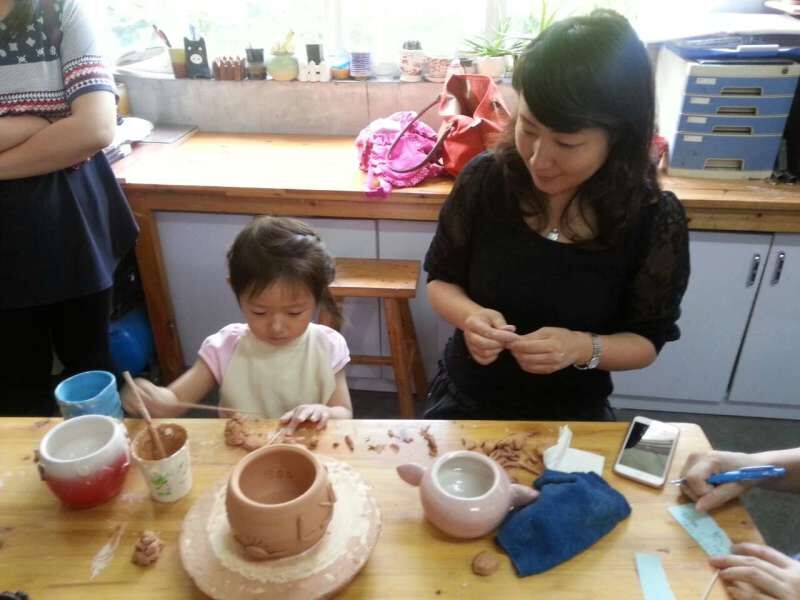 由于报名的家庭比较多,因而,这一天中将分别安排三场。原定的第一场9点开始,但已经有好多小朋友按捺不住激动的心情早早催着家长来报到了!工坊的老板夫妻很热情的接待了我们的小客人,手把手的教他们如何使用转盘和陶泥。细腻湿滑的陶泥在一双双小手中被逐渐塑造出了各种形状,然后再进行装饰加工。每个小朋友都以自己的方式完成着作品,幻想着两周后拿到成品要用来做什么,很期待呢!