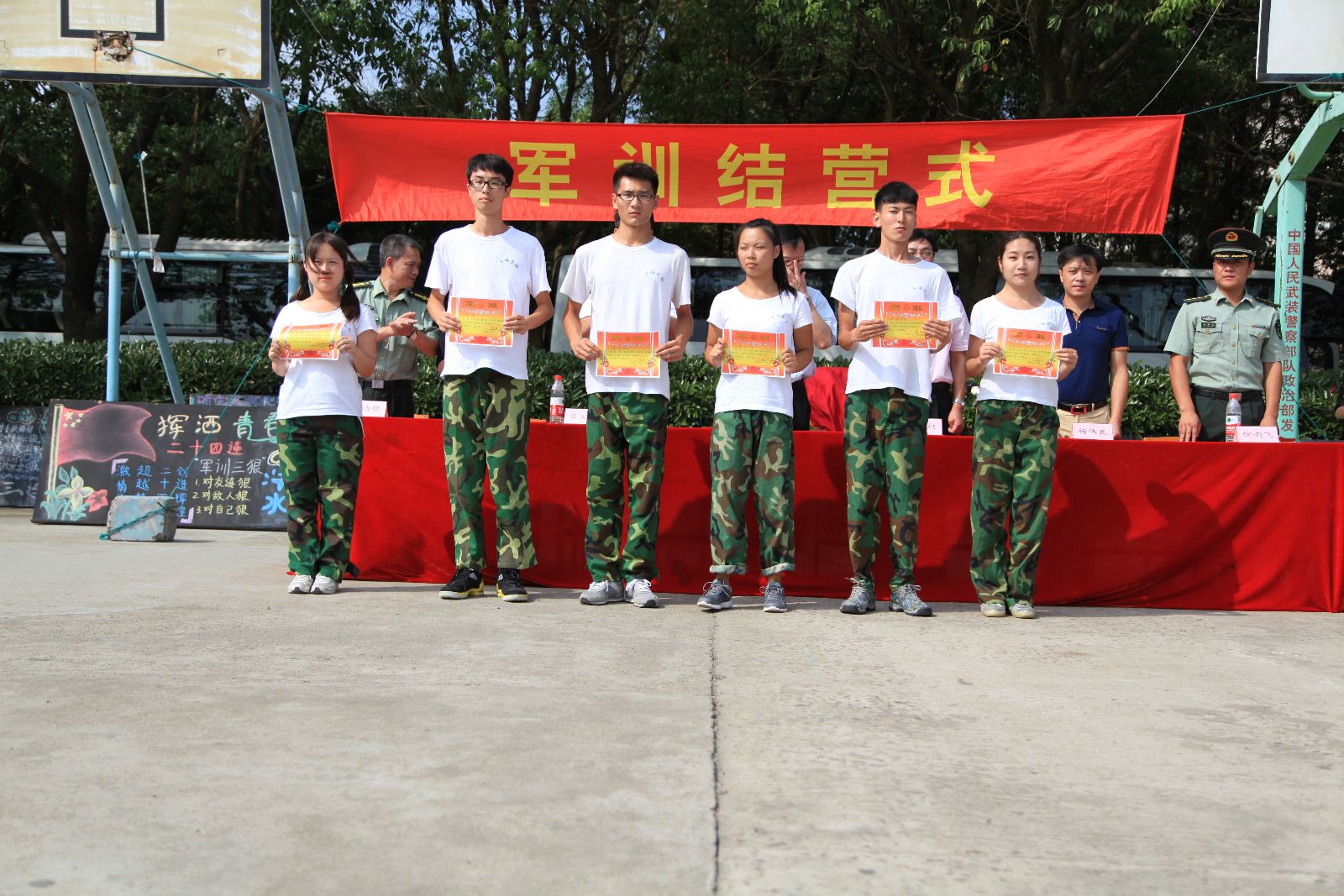 俞锦禄宣读《关于表彰2015年学生军训荣获各类荣誉称号的决定》。军训期间,涌现出了一批先进集体和先进个人。刘欣宇等62名同学军训获得“优秀营员”荣誉称号,一营男205等10个军训连获得“优秀内务”荣誉称号,一营三连等6个连队获得军训“优秀连队”荣誉称号。学院领导和部队首长为先进连队和个人颁奖。学生代表农经系观光152班赵雨蓉在发言中对教官和老师们表示了感谢,回顾了军训生活的苦与乐,表示要继续发扬拼搏精神,开启大学三年的新生活。