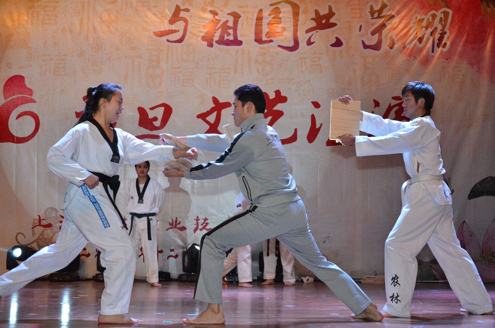 色彩斑斓的开场灯光秀让所有观众享受了一次视觉盛宴,现场气氛热烈,掌声雷动。晚会在热情奔放、大气磅礴的开场舞《龙鼓欢腾》中拉开序幕,现代舞《Call me baby》、女声二重唱《夜来香》、歌曲串烧《奔跑吧,青春》、音乐剧《猫》等用激情四射的热情凸显出以青春活泼为主旋律的青年文化的勃勃生机;瑜伽社、跆拳道社、旱地冰球社、武术社、汉宣社等带来的社团展示表演让更多师生了解到了校园文化的魅力;情景朗诵《青春中国》、小品《誓者》等向现场每一个人传递着铭记历史、缅怀先烈、珍爱和平、开创未来的美好愿望;从部队退伍的6位兵哥带来的军旅表演《我是一个兵》展示了他们绿色军营的风采和青年学生热爱祖国投笔从戎的赤胆忠心,更是将现场的气氛推向高潮。文艺汇演最后在歌伴舞《国家》的精彩表演中落下帷幕。