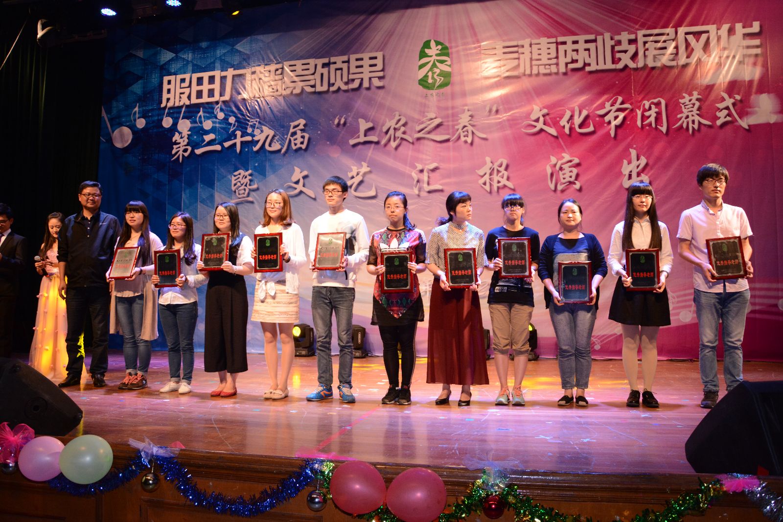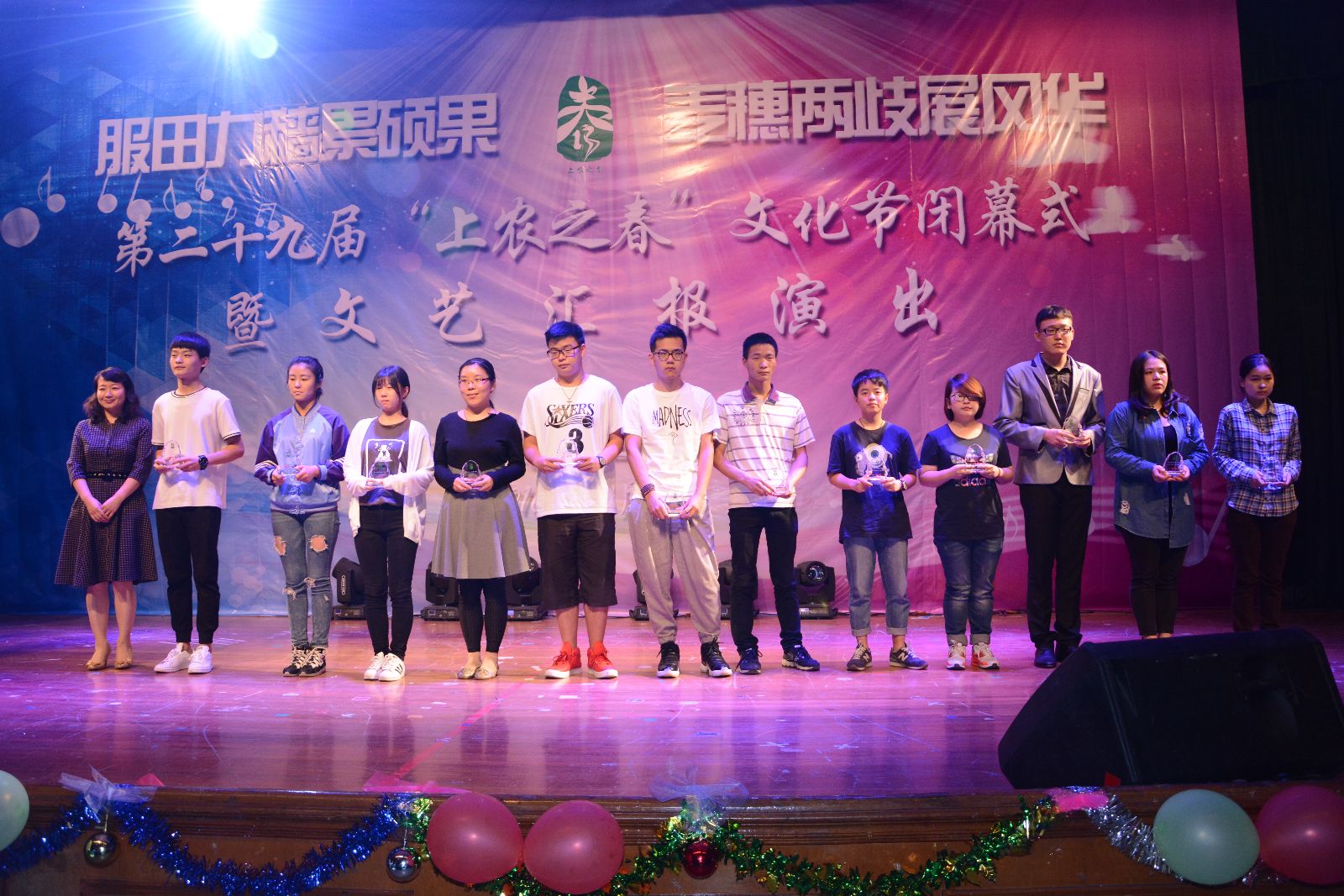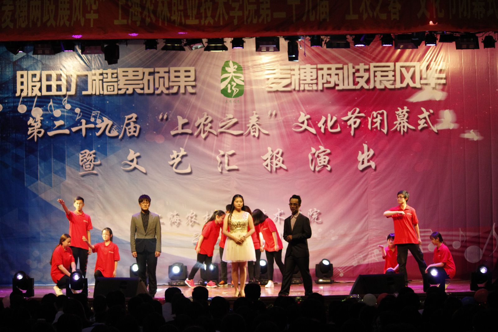 闭幕式上,龙、鼓表演《龙鼓欢腾》、情景朗诵《青春报告》、相声《规矩》、新疆舞《花儿为什么这样红》、环保服饰走秀表演和歌曲《年轻的战场》等形式多样的文艺节目交映生辉,展现了上农学子在学院校园文化中锻炼成长、全面发展、追逐梦想的青春风采。文艺演出最后在全场欢腾的舞蹈《中国范儿》的精彩表演中落下帷幕。