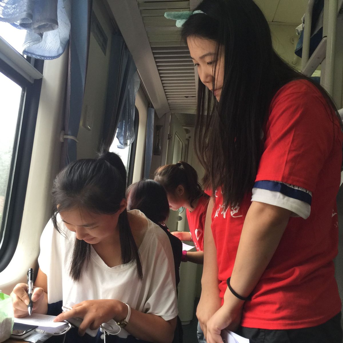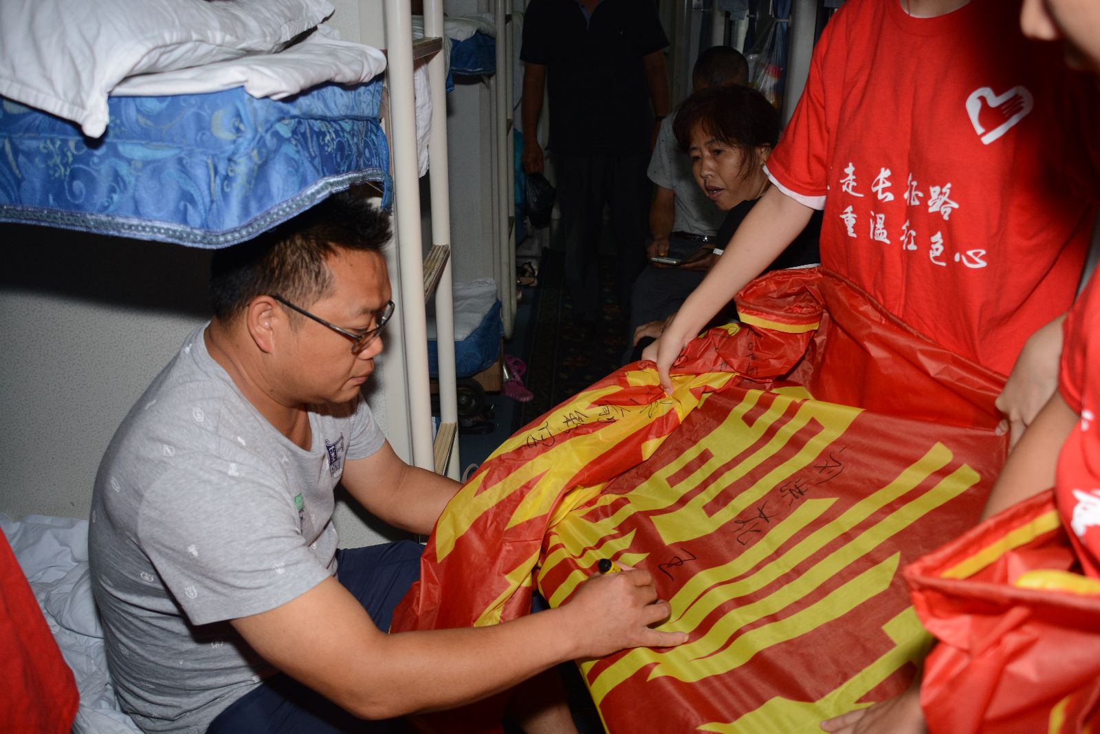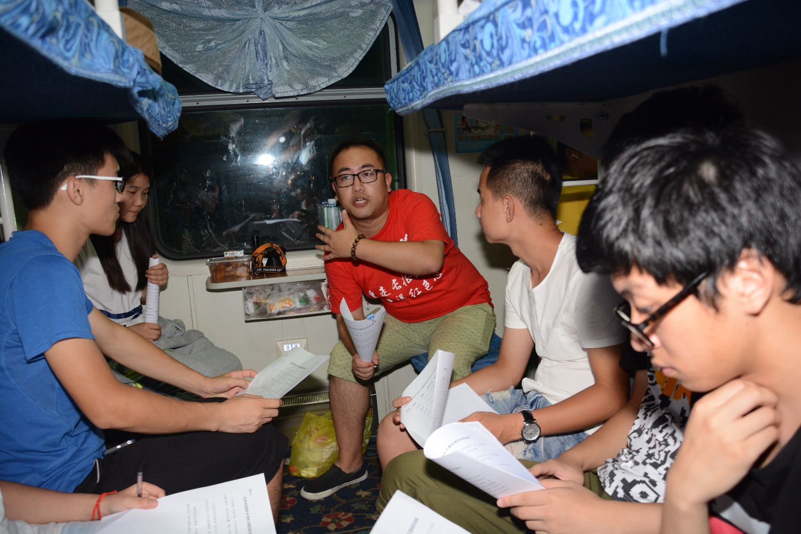 途经40个小时的车程考验着11位师生的意志力,在列车上师生们互相簇拥着进一步商讨此次“重走长征路”的行程安排,并与广大乘客、列车员开展了横幅签名活动和长征历史调查问卷。这不仅宣传了长征知识,还与大家一起重温历史,坚定信念。