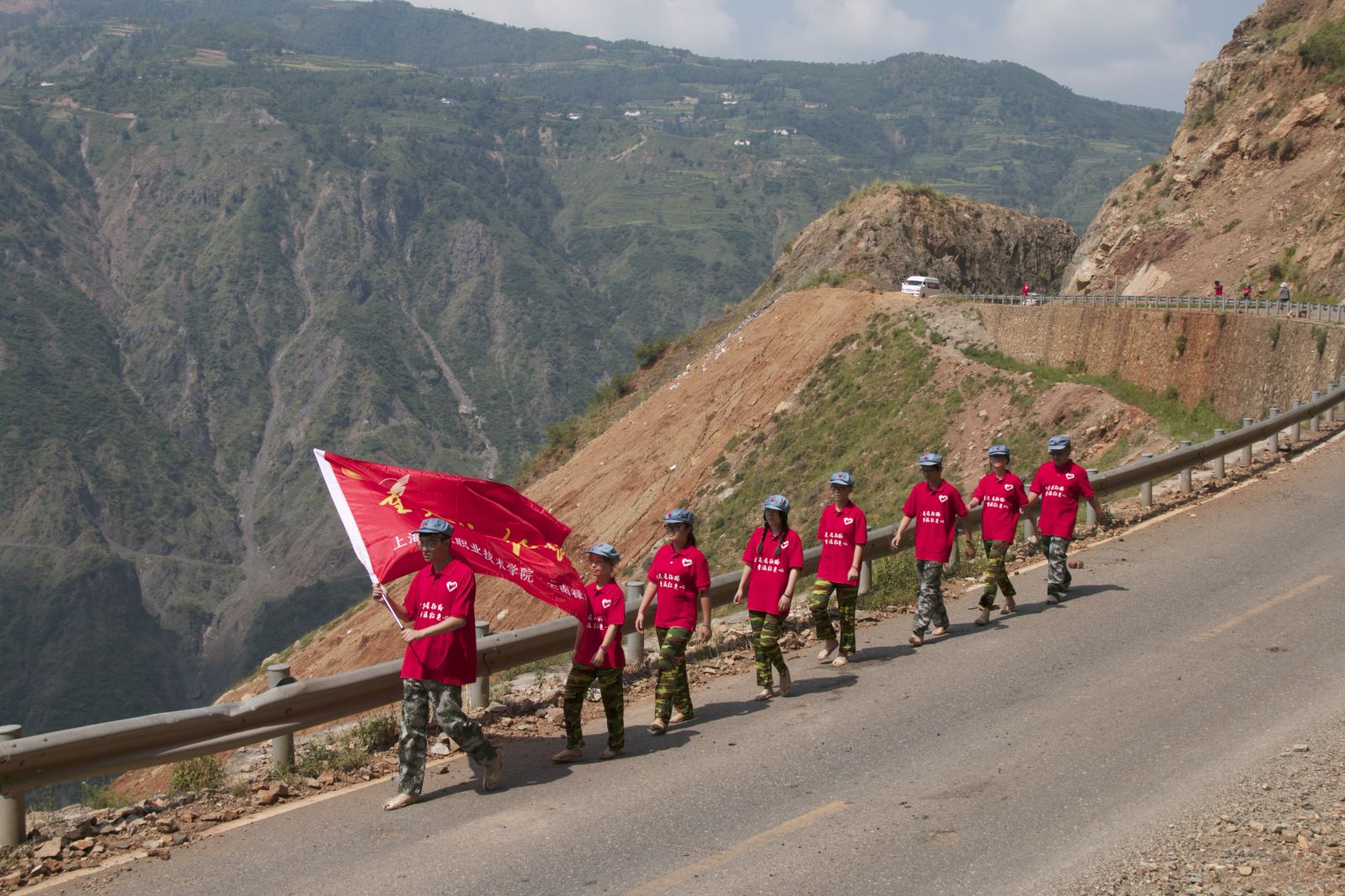 来到皎平渡大桥的山路,师生们为了深刻体验当年红军长征的不易,换上了草鞋,开始了重走长征路。虽然山路蜿蜒崎岖,一路由于下雨,多处塌方给本次行程带来了重重的困难与挑战。但公路上的牧羊人,时不时窜出的小动物以及美丽的自然风光不断激励着大家不忘初心,继续前行。在徒步10余个小时的长征路中,同学们途径云南皎平渡和四川大凉山等地,都留下了他们的足迹和汗水,同时更是被革命先烈的精神和气节所打动,深刻体会到了红军在当时艰苦的条件下,面对敌人的围追堵截,选择长征这一战略大转移的不易。