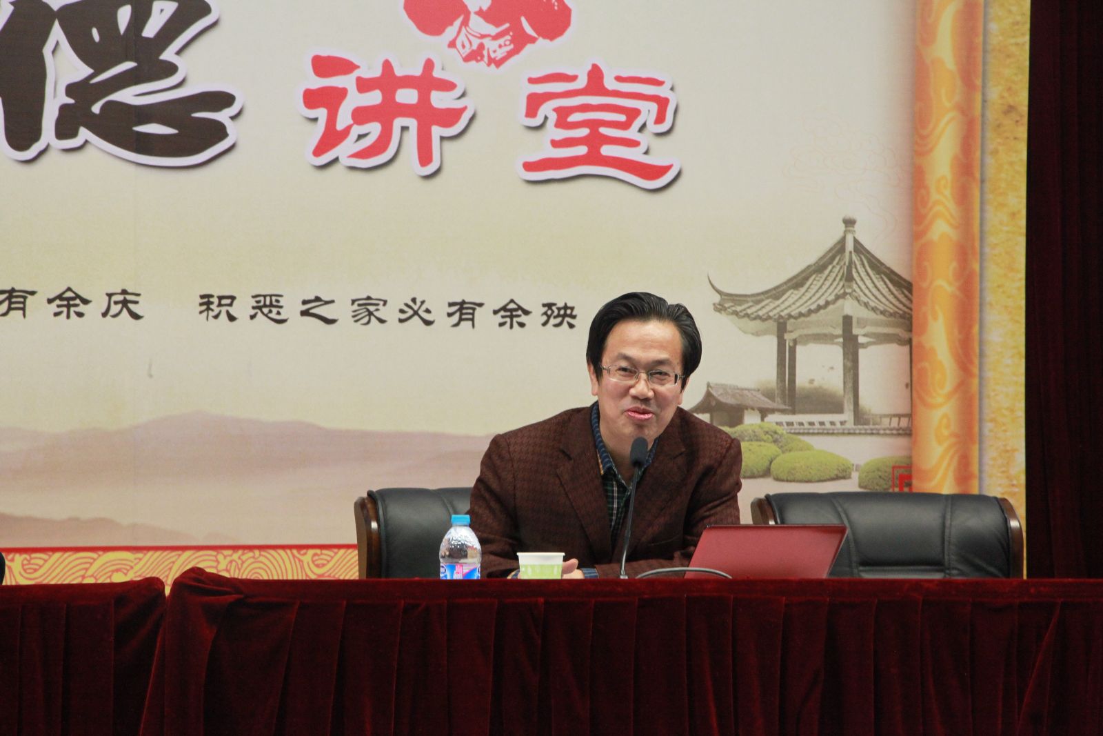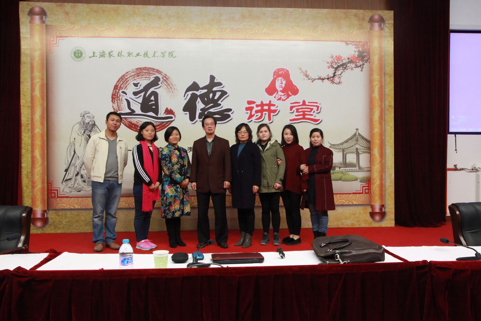 樊清誉在道德讲堂结束时讲道:王教授在百忙之中到校开讲,就是希望每一位同学都能正确对待自己的学习、生活。希望同学们尽快适应大学的生活,能够树立自己的理想和奋斗目标,珍惜三年时光努力学习,学会做人,学会做事,掌握一技之长。理想不是空谈,是在每天坚实的勤勉努力中不断接近和实现的。只有自尊自强,才能获得他人的尊重和欣赏。看重自己,不虚度光阴,为理想而奋斗,才能有人生出彩的机会,才能在这个世界上有尊严地生活着。讲堂结束后,部分教师与王教授合影留念。