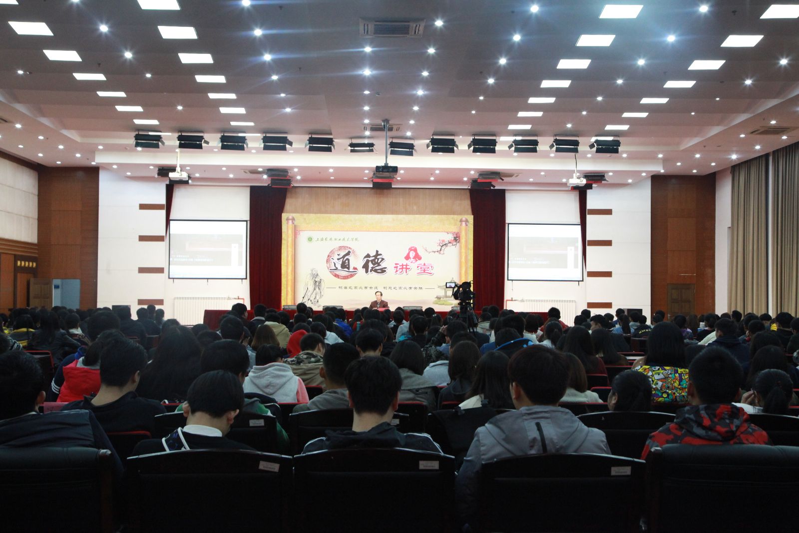 11月17日晚,道德讲堂第三讲开讲,由华东师范大学王建新教授主讲“扬起理想风帆 奔向美好未来”。近1300名2016级高职学生和2014级中高贯通班学生,分别在主会场(205报告厅)和分会场(一教、二教的各班自修室)参加了道德讲堂的学习。宣传处处长、思政部主任樊清誉主持道德讲堂。