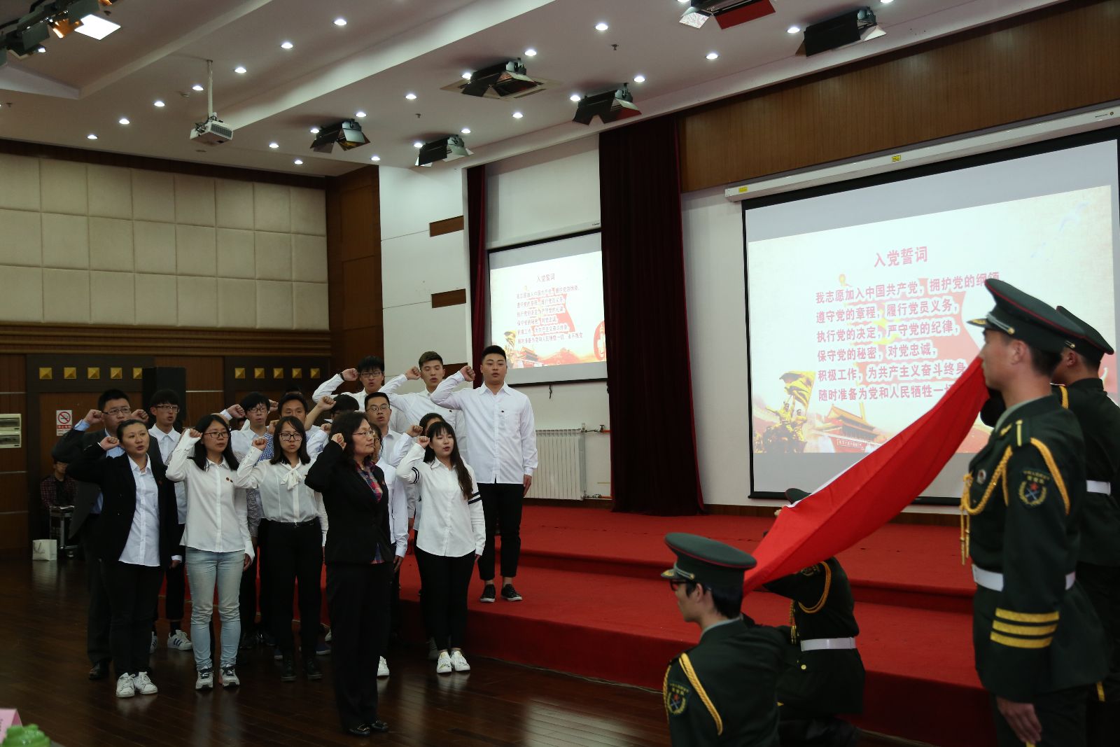 在领誓人党委宣传统战处处长樊清誉的带领下,部分教师党员和学生党员面对鲜红党旗,重温入党誓词。大家高举右手,紧握右拳,再次庄严地宣读入党誓词,宣誓铿锵有力,慷慨激昂。