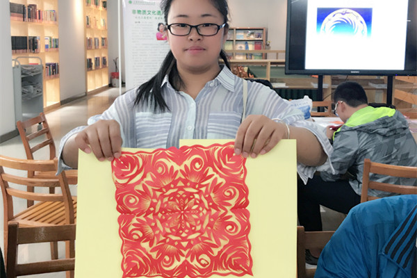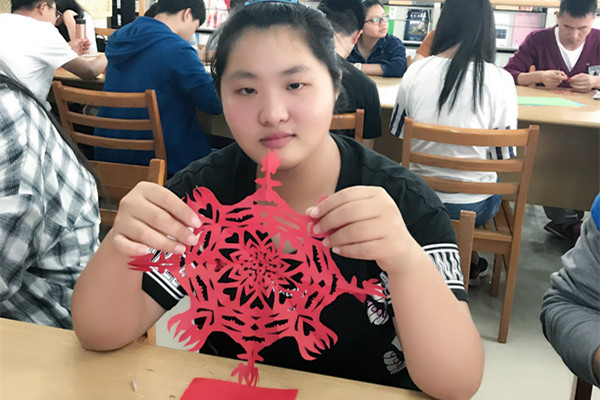 奚小琴现场进行脱稿剪纸演示。一把剪刀,一张纸,不一会儿,一只活灵活现的剪纸鸡就呈现在大家面前。高超的技艺表演激发了师生们的创造欲,大家纷纷拿起剪刀和纸,按照自己的构思进行创作。奚小琴告诉大家要注意点、线、面、镂空和留存,要有想法,这样呈现出来的作品才好看。看到同学们制作的均齐图案,奚小琴一一给予指点和解说。同学们惊叹奚小琴剪刀运用的熟练,两剪就把一个“双喜”字剪出来了,奚小琴告诉大家这是长期基本功训练的结果。几位师生的剪纸作品得到了奚小琴的夸赞,她鼓励有剪纸兴趣的同学要勤加练习,还向他们推荐好用的剪刀。