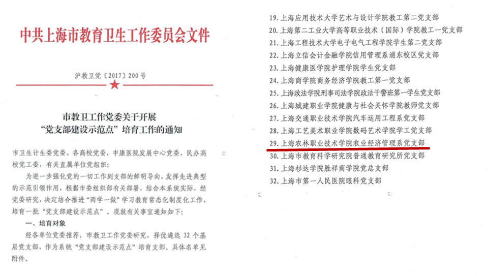 近日传来喜讯,我院农业经济管理系党支部成功入选上海市教卫工作党委系统“党支部建设示范点”培育支部。