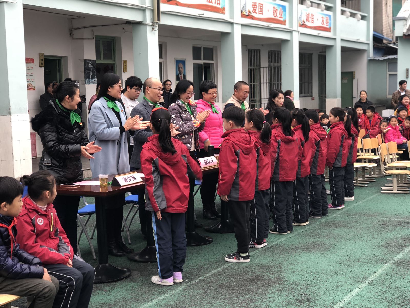 活动开始,潘家浜小学少先队队员们为各位领导和来宾敬献绿领巾。随着操场上空响起《绿领巾之歌》,农业经济管理系辅导员和“农情”志愿者为新加入“小红星”儿童团的小学生佩戴绿领巾。吴逸文发表讲话,希望新入团的小苗苗们能在党的光辉下茁壮成长。