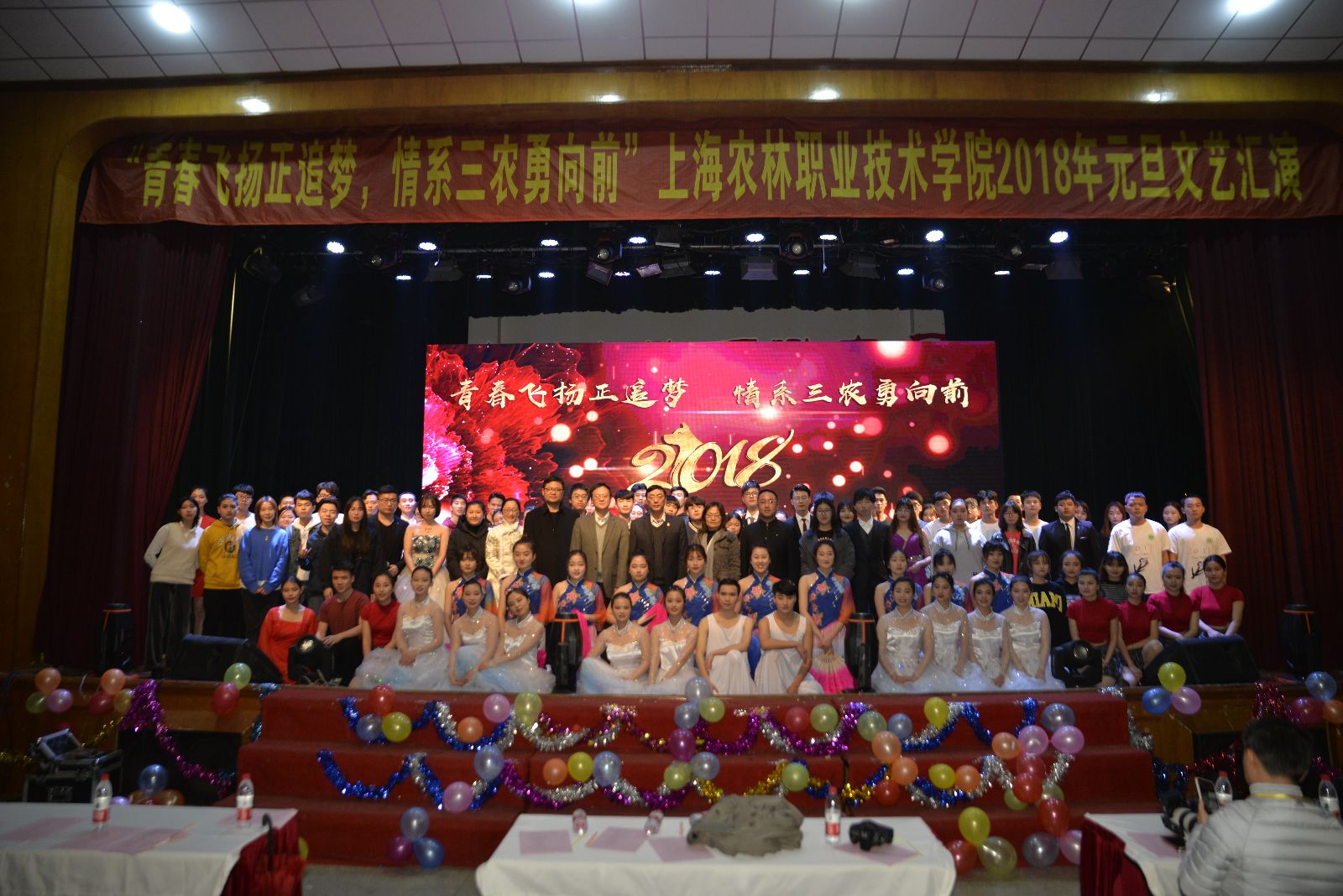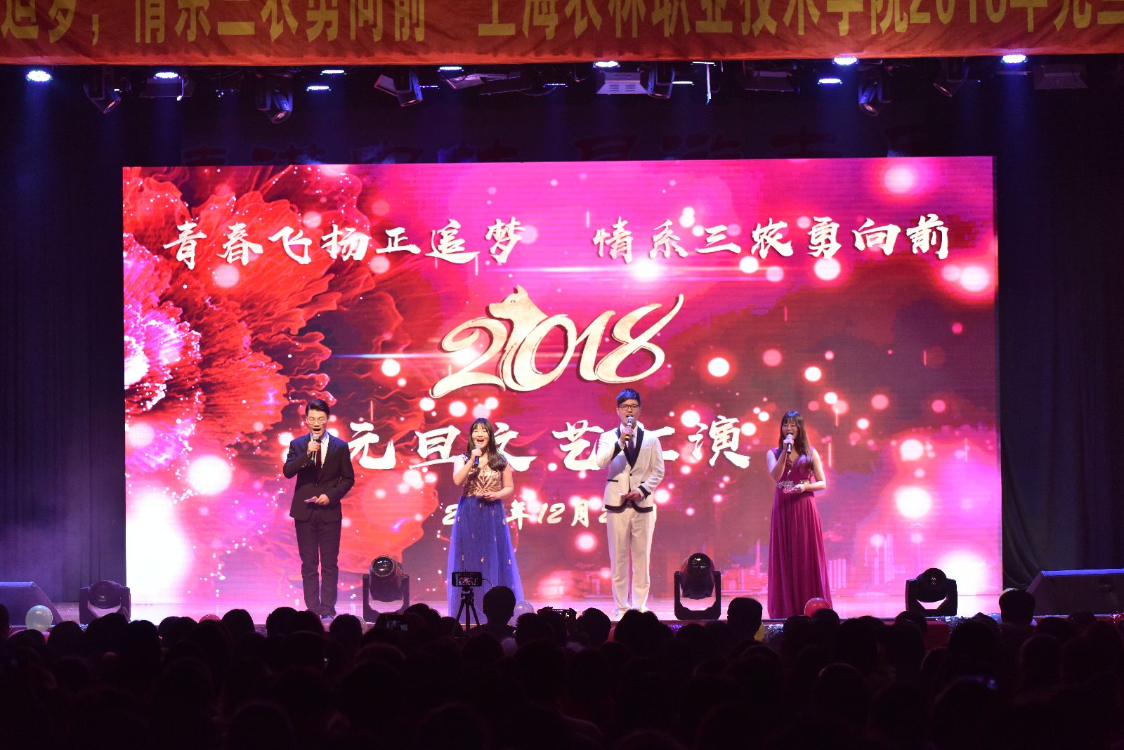 12月28日,由团委主办的“青春飞扬正追梦 情系三农勇向前”2018年元旦文艺晚会,在大礼堂举行。党委副书记、院长魏华,党委副书记、副院长俞锦禄,工会主席高功辉出席晚会,相关职能部门负责人、支部书记、各系学生工作负责人、教职工及学生代表共千余人观摩演出,共庆元旦佳节。