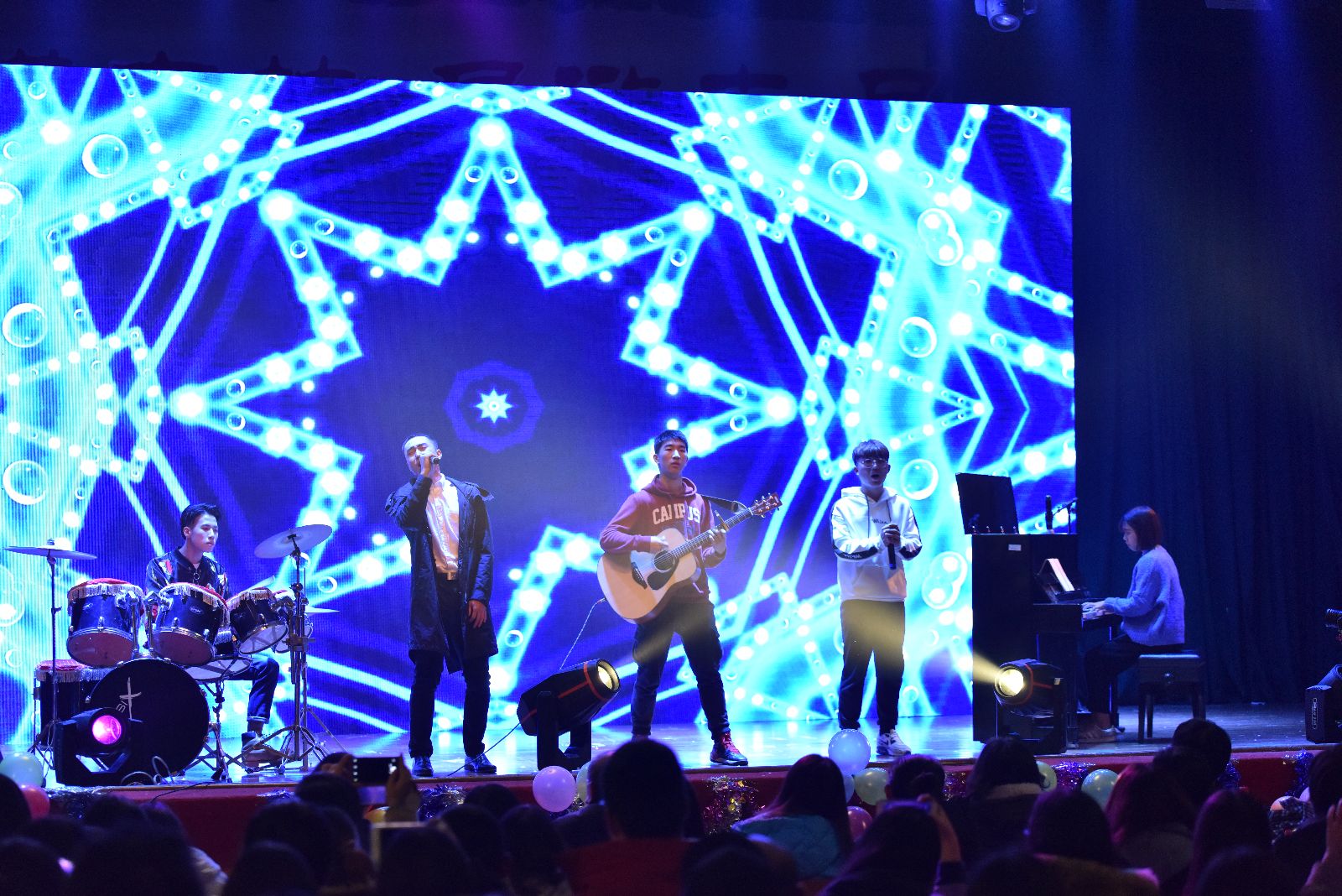 元旦文艺晚会作为校园文化建设品牌活动之一,也是文化育人提升工程的重要载体。这场由师生自编自导,融歌曲、舞蹈、小品、魔术、朗诵等节目于一体的大联欢历时两小时,150余名师生同台献艺。绚丽的灯光效果、巨大的舞台银幕,营造出专属“上农人”的情怀。