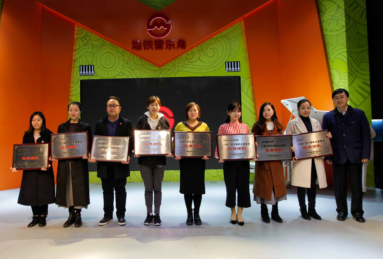 活动现场揭晓了上海大学生地铁志愿服务示范站及优秀团队。我院和上海工程技术大学、上海大学、上海师范大学、上海交通职业技术学院、上海理工大学、上海对外经贸大学、上海健康医学院获得上海大学生地铁志愿服务优秀团队,上海申通地铁集团有限公司党委副书记葛世平为8所高校授牌。