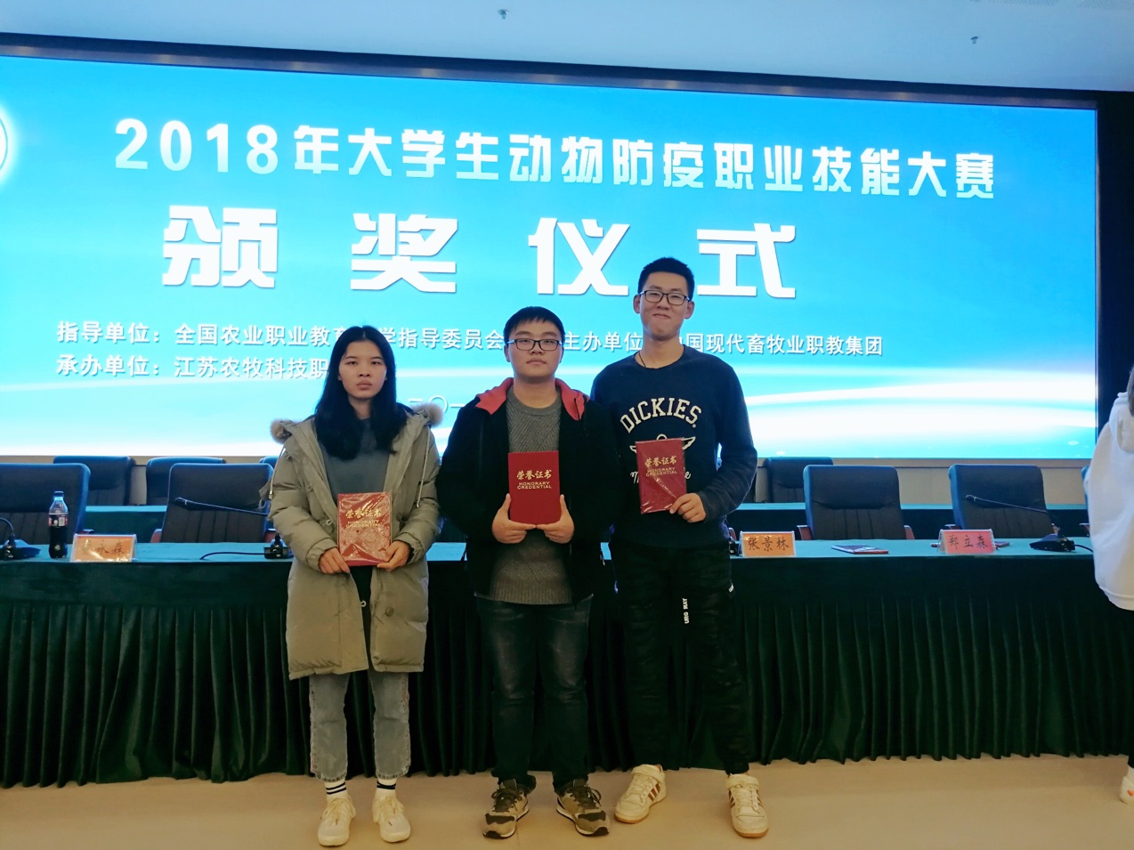 11月23日—25日,由全国农业职业教育教学指导委员会指导、中国现代畜牧业职教集团主办的2018年全国大学生动物防疫职业技能大赛总决赛,在江苏农牧科技职业学院举行。来自全国22个省份33所高职院校学生参赛。我院动科系3名学生组成参赛队,最终获得团体二等奖,总成绩排名第九。