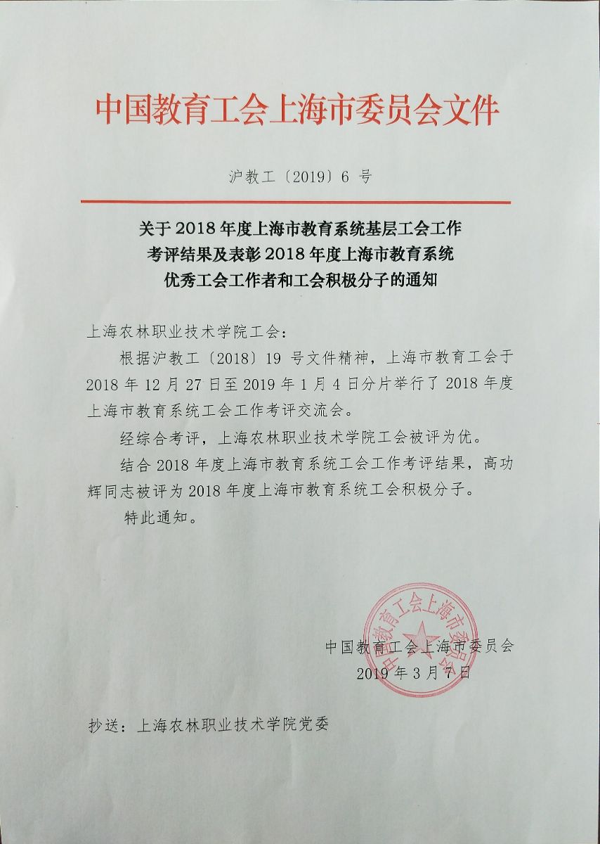 根据《上海市教育工会关于2018年度上海市教育系统基层工会工作考评结果及表彰2018年度上海市教育系统优秀工会工作者和工会积极分子的通知》沪教工[2018]19号文件精神,经综合考评,学院工会被评为2018年度优秀工会,高功辉同志被评为2018年度上海市教育系统工会积极分子。