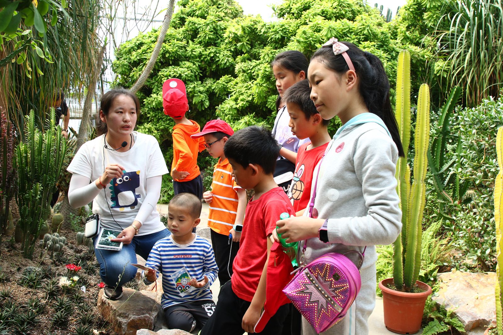 在温室大棚里,“小好奇”们,一边认真听着指导老师的讲解,一边睁大眼睛观察神奇的植物,在听完讲解老师对含羞草习性的介绍后,小朋友们一个个伸出小手指碰一碰含羞草,感受它的奇特之处。