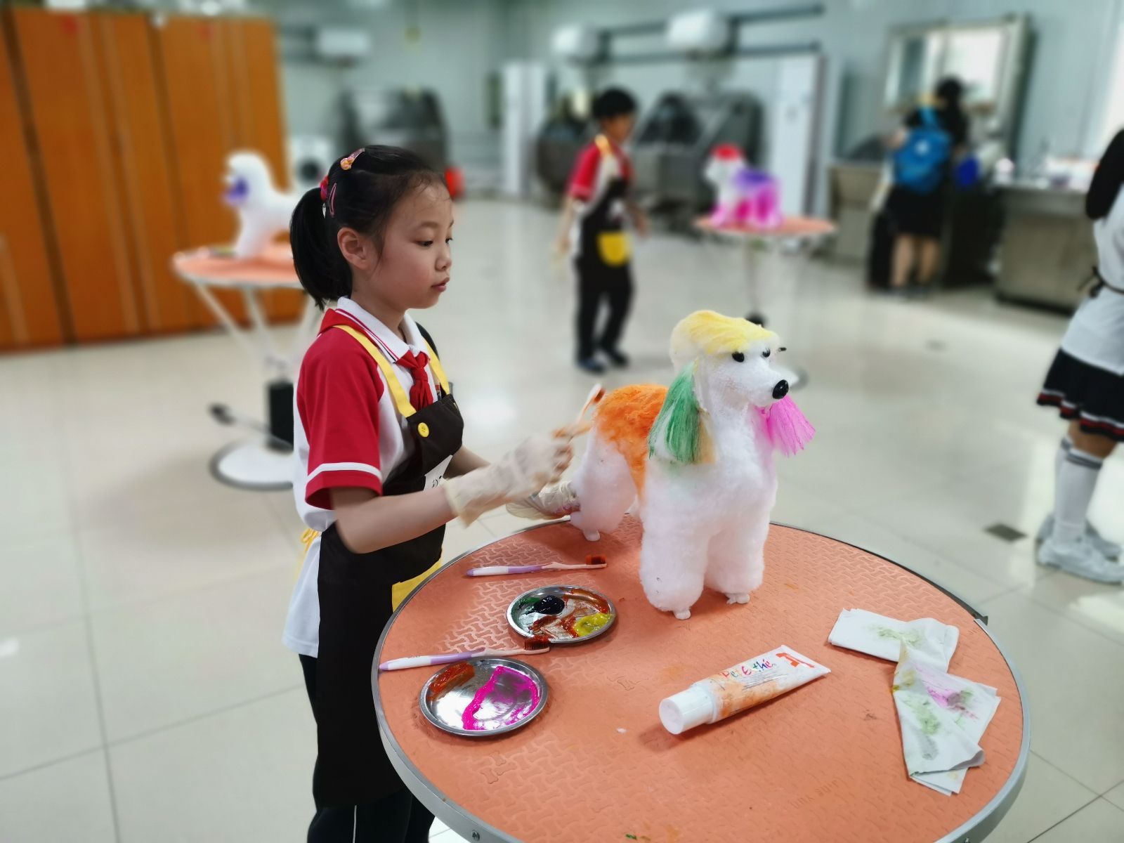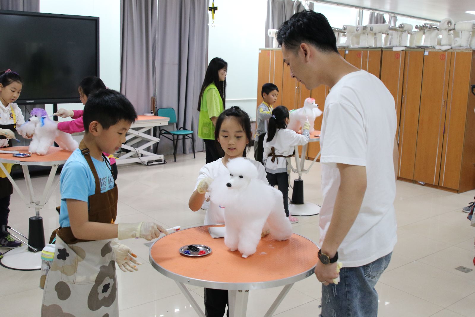 在宠物美容实训室,小朋友们化身宠物美容师,给宠物模型贴披上白色的毛片,用喷雾式和药膏式染剂进行图案彩绘,给宠物们制作一件别样的“花衣服”。看到经过装扮一新的宠物狗狗后,大家哈哈大笑,感受到了宠物美容师的职业感。