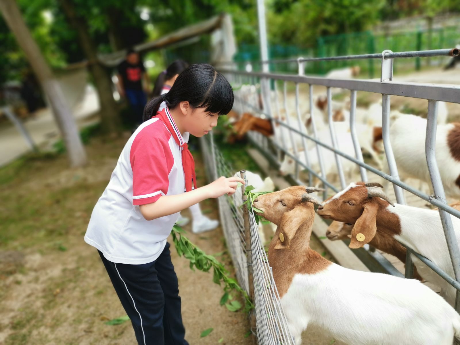 学生与山羊互动喂食