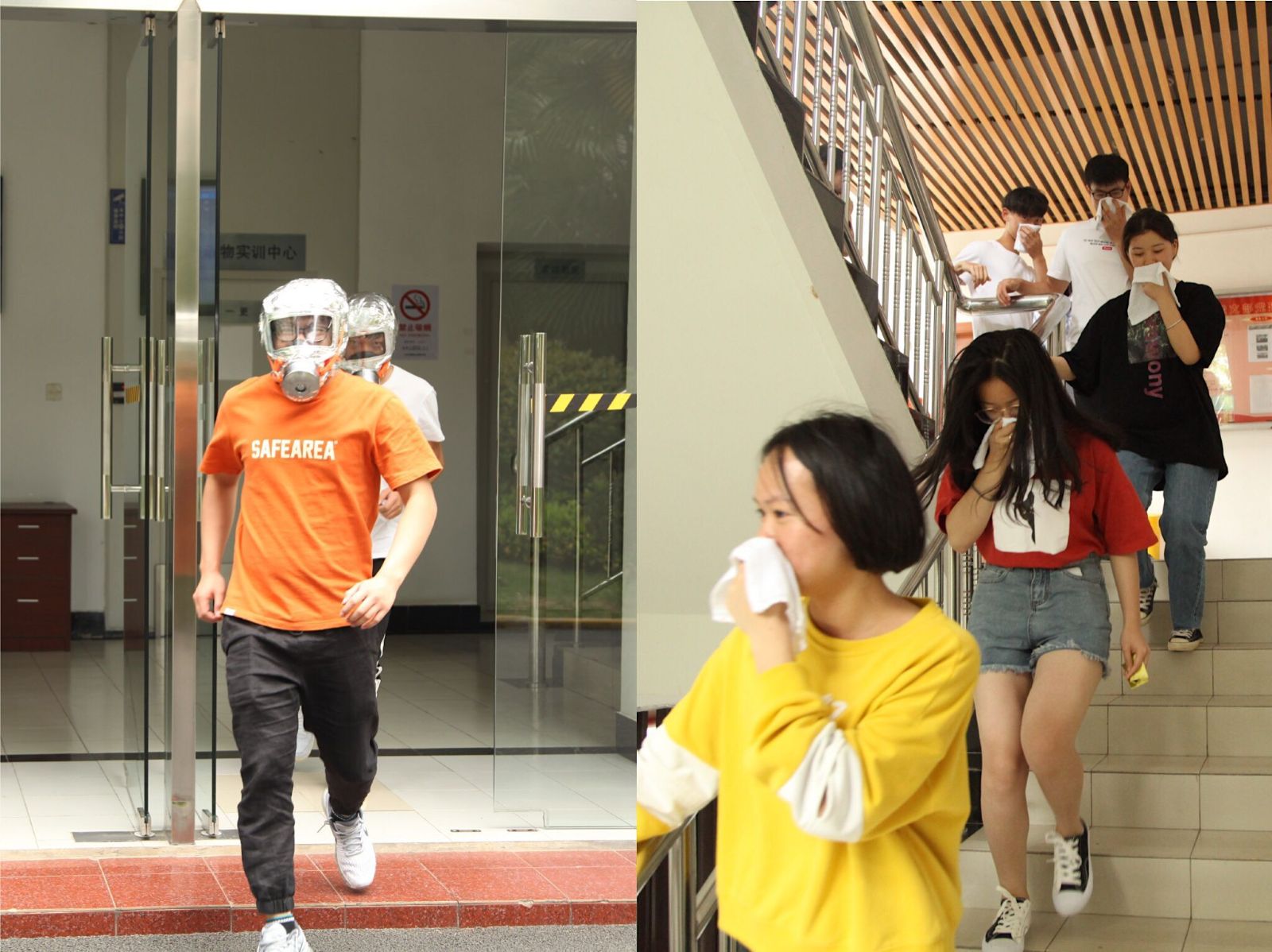 12点整,消防报警声准时响起,动科实训楼内值班老师迅速作出反应,模拟拨打火警电话,物业切断楼内电源并向学生处、保卫部门报告,辅导员、校平安志愿者沉着冷静的指导学生用湿毛巾捂住口、鼻,尽量放低身体,有效撤离“危险区域”,参与演习的师生安全有序地快速撤离实训楼,到达安全疏散地点。学院医务室、红十字会老师,在第一教学楼前,对“伤员”进行救护,学生处老师负责清点人数,并层层向上汇报,接到模拟火警电话后,消防队人员抵达现场,进行灭火救援,控制险情并检查现场,确保楼内无人。整个逃生演练过程迅速、有序。
