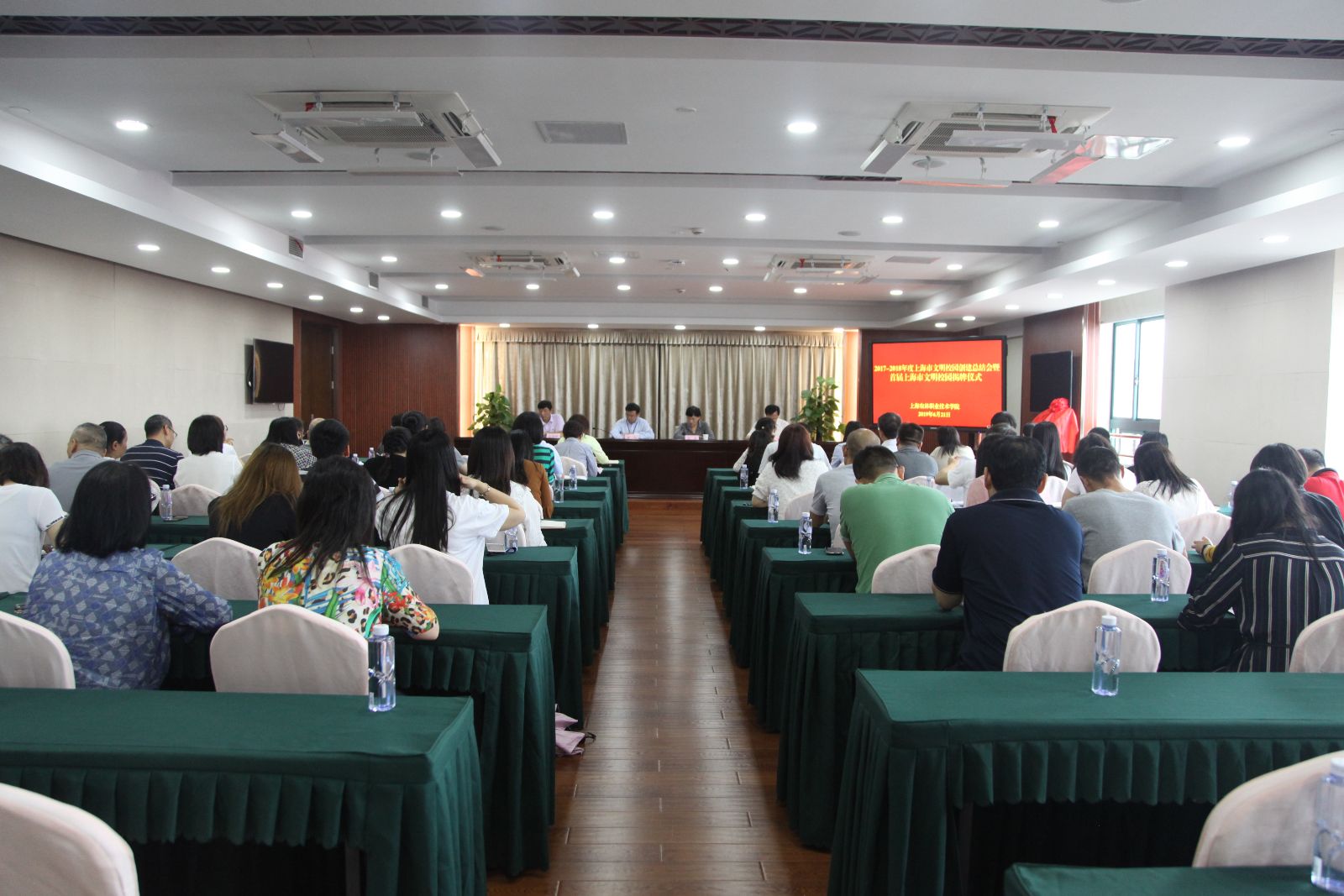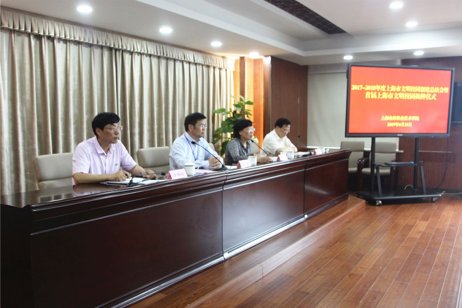 6月21日上午,在第三会议室,学院召开2017-2018年度上海市文明校园创建总结会暨首届上海市文明校园揭牌仪式。上海市教卫工作党委宣传处副调研员俞真应邀参加揭牌仪式。党政班子、全体中层干部,各部门信息员、各支部宣传委员共65人参加会议。党委副书记、院长魏华主持仪式。
