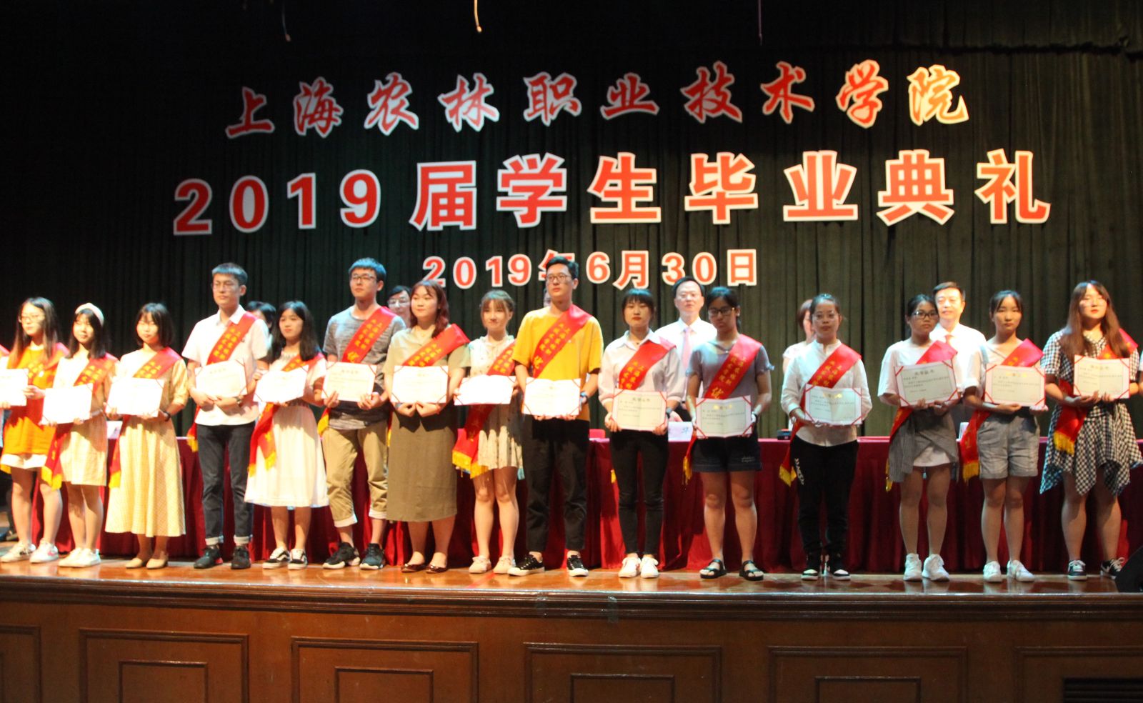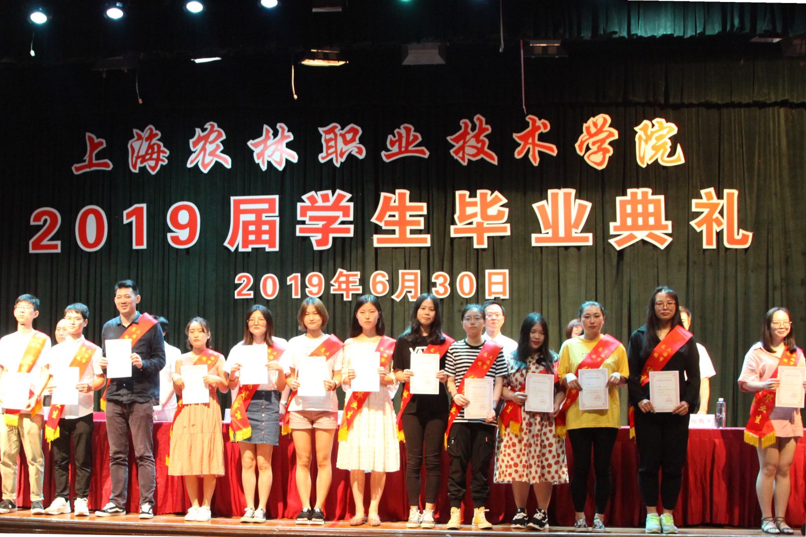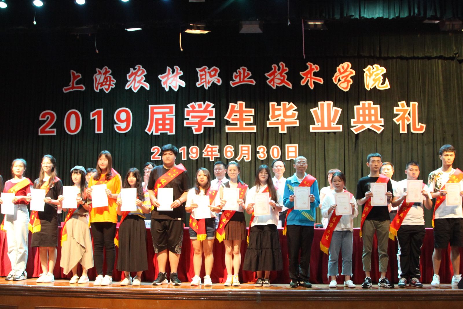 党委副书记俞锦禄宣读《关于授予侯溢等36名同学“上海农林职业技术学院2019年度优秀毕业生”荣誉称号的决定》和《关于秦雪珠等36名同学荣获“2019年度上海市优秀毕业生”荣誉称号的通知》,副院长谢锦平宣读《上海农林职业技术学院关于准予2019届毕业生毕业的决定》,党政领导现场颁发上海市高校优秀毕业生、学院优秀毕业生和学生毕业证书。