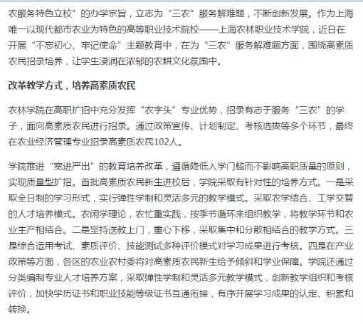 农林学院在高职扩招中充分发挥“农字头”专业优势,招录有志于服务“三农”的学子,面向高素质农民进行招录。通过政策宣传、计划制定、考核选拔等多个环节,最终在农业经济管理专业招录高素质农民102人。学院推进“宽进严出”的教育培养改革,遵循降低入学门槛而不影响高职质量的原则,实现质量型扩招。首批高素质农民新生进校后,学院采取有针对性的培养方式。一是采取全日制的学习形式,实行弹性学制和灵活多元的教学模式。采取农学结合、工学交替的人才培养模式。农闲学理论,农忙重实践,按季节循环来组织教学,将教学环节和农业生产相结合。二是坚持送教上门,重心下移,采取集中和分散相结合的教学方式。三是综合运用考试、素质评价、技能测试多种评价模式对学习成果进行考核。四是在产业政策等方面,各区的农业农村委将对高素质农民新生给予倾斜和学业保障。学院还通过分类编制专业人才培养方案,采取弹性学制和灵活多元教学模式,创新教学组织和考核评价,加快学历证书和职业技能等级证书互通衔接,有序开展学习成果的认定、积累和转换。