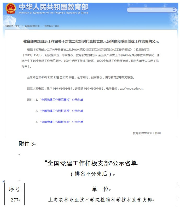 近日,教育部思想政治工作司公示了第二批新时代高校党建示范创建和质量创优工作结果,我院植物科学技术系党支部光荣入选“全国党建工作样板支部”名单,将与全国其他高校的999个党支部同在一个平台建设发展。