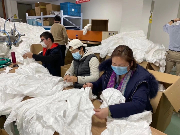 在诚格生产企业,根据志愿者团队的服务时间进行分批分班后,他们被分配到防护服的整理和包装的辅助工作中。那几夜,他们剪了一夜线头和折了一夜的衣服,但亲眼看到包装好后的防护服要封箱送到战疫一线时,心里就觉得暖暖的。