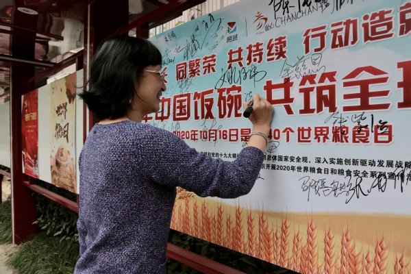 活动前期,易班学生工作站通过优课已建立爱粮节粮相关课程,目前已有700余名学生参与线上答题。活动现场,松江区粮食和物资储备局工作人员为同学们发放粮食安全宣传手册,一对一宣传节约粮食知识,希望同学们安全用粮、健康消费,避免浪费粮食。师生们还在“端牢中国饭碗 共筑全球粮安”签名墙上签署承诺,为粮食安全代言,争做粮食安全文明使者,向浪费粮食说“不”。