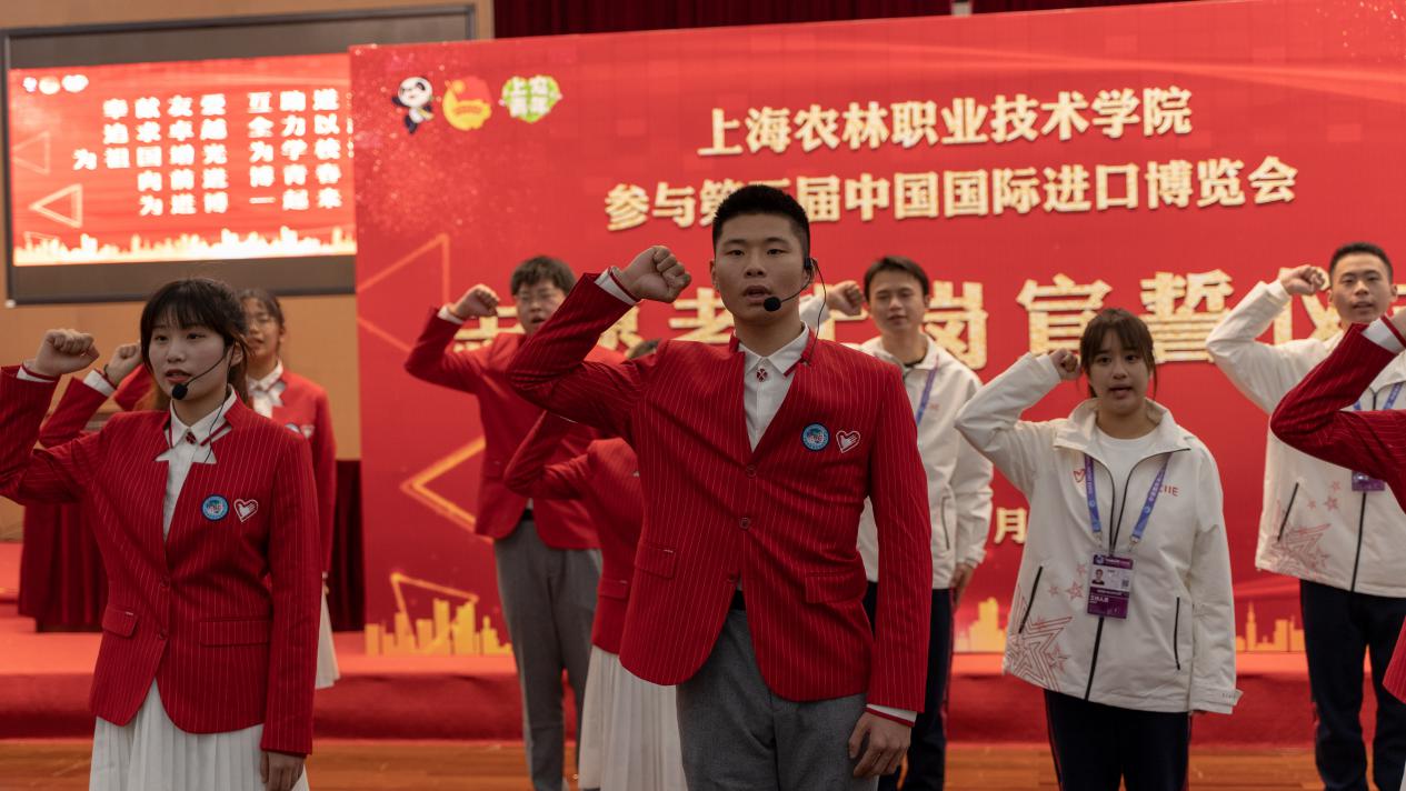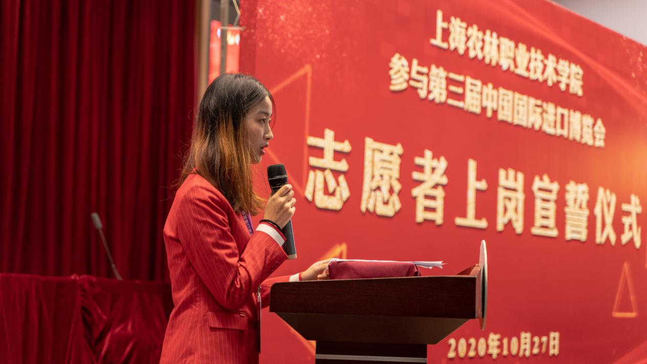 仪式上,党委学工处、学生处处长沈悦为志愿者服务团队授旗,她肯定了前两届进博会期间志愿者们的辛勤付出,同时对本届进博会志愿者提出三点希望:一是在志愿服务中提高政治站位,厚植爱国主义情怀;二是在身体力行中不忘志愿初心,凝聚青春力量;三是在长期实践中练就过硬本领,强化使命担当。努力引领上农小叶子为第三届进博会提供一流服务、展现一流形象、作出一流成绩,为学校争光添彩。