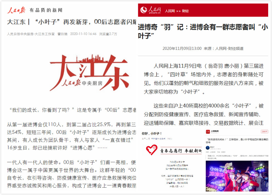 服务期间,院团委组建2个临时团总支,7个临时团支部,进一步加强对团员志愿者的思想动员和政治引领,发挥先锋模范作用;分别在服务场馆和住宿点开展2场主题团日活动,志愿者代表分享了自己对习近平总书记在第三届进口博览会的主旨演讲的学习感悟和志愿者工作中的所见所闻,充分感受本次进博会成功举办的重大战略意义和中国扩大开放的坚定信心。“小叶子”们以昂扬姿态奋斗在各个岗位,获得了参访嘉宾、展位负责老师等一致好评,优秀事迹也受到了人民日报、人民网、中国青年志愿者、解放日报、文汇报、新闻晨报、青年报、上海发布、青春上海、上海青年志愿者、团在校园上海学联等数10家媒体平台报道宣传。