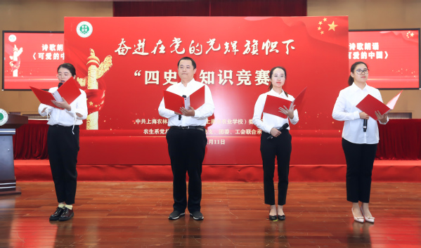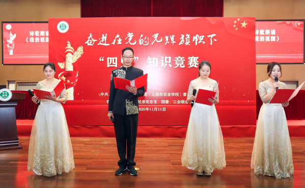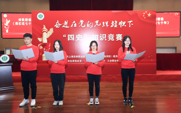 来自学校基层党组织的12支参赛队伍、36名党员教师参加了知识竞赛,共分为必答题、抢答题、风险题3个答题环节。比赛中,参赛选手各显身手,应对如流,踊跃抢答,引发现场观众阵阵掌声。诗歌朗诵作为本次比赛的一个加分项也是异常精彩。由教学管理党支部张雷、学生管理党支部车逸兰、农信系党总支祁海珍和实训基地党支部彭心燕联合朗诵《可爱的中国》,由行政管理党支部赵英媛、植科系党总支高翔、园林系党总支蔡新元和农生系党总支夏俐雯联合朗诵《我们这七十年》,由文化宣传党总支司维、后勤服务党支部张晶清、动科系党总支白雪瑞和农经系党总支王桂霞联合朗诵《我的祖国》,三个作品得到评委和观众的一致好评。