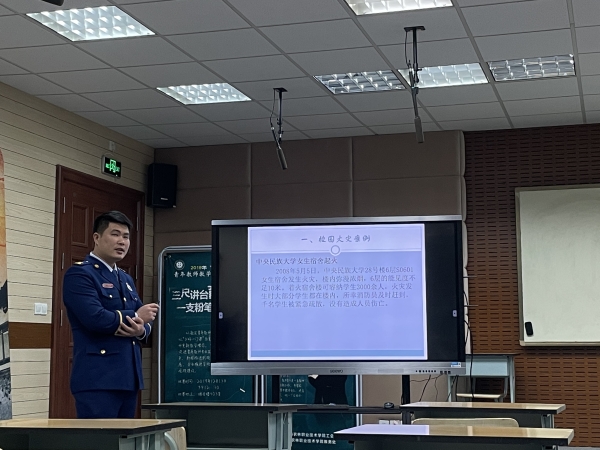 班长从“校园火灾案例、火灾基础知识、火灾的预防和火场逃生”四个方面来,用案例来阐述火灾产生的原因及其危害,发生火灾时逃生自救九大要诀和常用灭火器的使用方法,指出消防安全意识所存在的问题,强调消防安全的重要性。