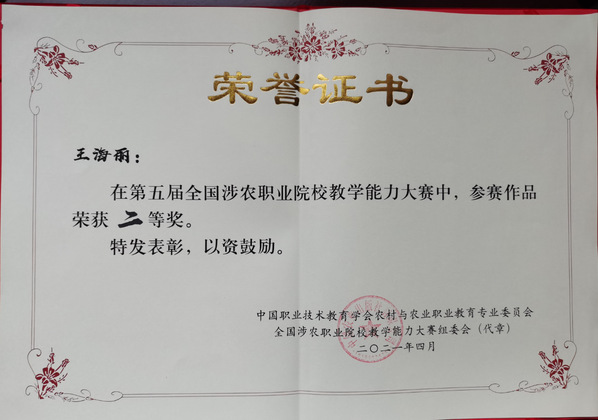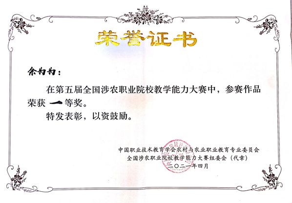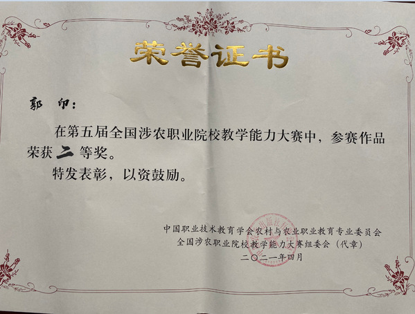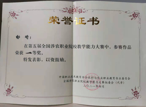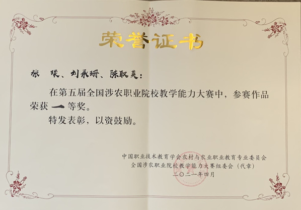 4月24日,由中国职业技术教育学会农村与农业职业教育专业委员会、中国农业出版社共同主办的第五届全国涉农职业院校教学能力大赛决赛现场传来捷报,我校6支参赛队伍全部获奖,高职组张琰教学团队、郁琦分别荣获种植组、农业经济组一等奖,王海丽、郭印分别荣获农业经济组、养殖组二等奖;中职组佘为为、岳钉伊分别荣获种植组一等奖,种植组二等奖。