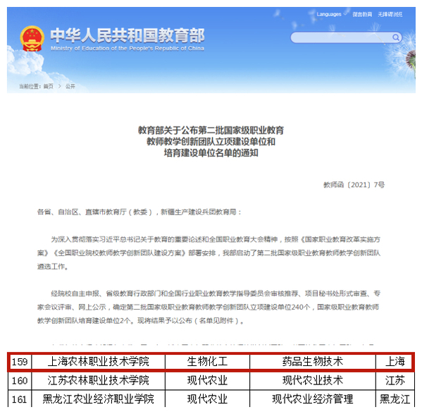 近日,教育部第二批国家级职业教育教师教学创新团队立项建设单位名单公布,学院药品生物技术专业教师团队成功入选建设名单之一。