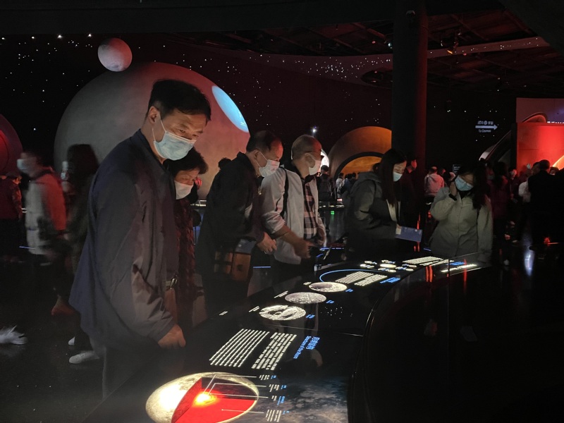在参观的过程中,老同志们最喜欢的当属“征程”展厅,不仅有大家熟悉的“地心说宇宙观”“日心说宇宙观”内容展示、伽利略书房等,还有玉兔二号登月车模型、祝融号火星车模型和格外引人注目的天宫号空间站模拟仓。