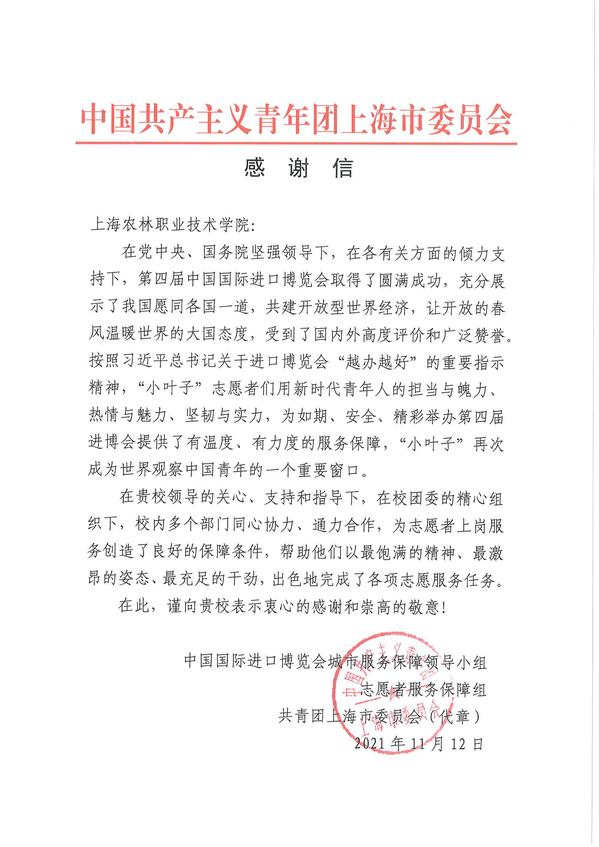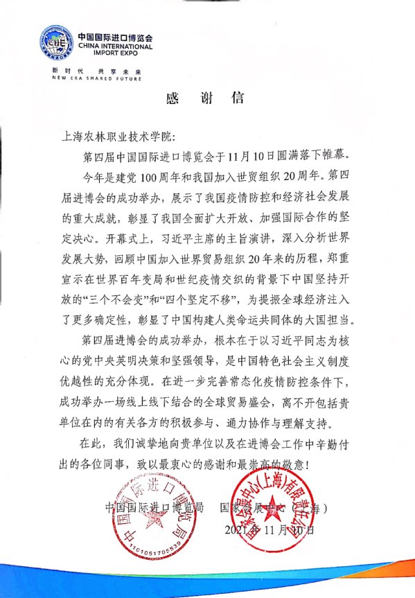 近日,学院分别收到来自中国国际进口博览局、国家会展中心(上海)和中国国际进口博览会城市服务保障领导小组、志愿者服务保障组、共青团上海市委员会的感谢信,感谢学院在第四届中国国际进口博览会工作中付出的辛勤和努力。感谢信内容如下: