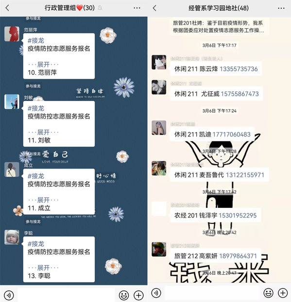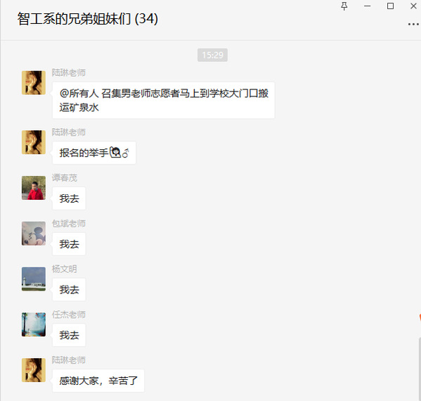 “后勤急需物资发放志愿者”“女生宿舍楼需要志愿者”“教学楼需要志愿者帮忙领餐送餐”“召集志愿者到学校门口搬运矿泉水”……工作群中,一条条志愿者招募公告一发出,转眼人员就报满。 “智工系11名教师志愿者在来的路上了”“教学管理支部志愿者马上上岗”“行政管理我们来了”……文化思政党总支、实训基地党支部各个二级党组织和教学系部纷纷响应。主动报名请缨,迅速抵达现场,积极投身疫情防控志愿服务中。搬运物资、分发物资、餐食配送、维持秩序、防疫宣传等等,上农师生志愿者用一个个小小的举动汇聚成抗“疫”合力,用实际行动践行关键时刻顶得上去、冲得上去的战斗精神。