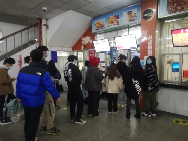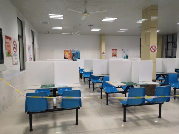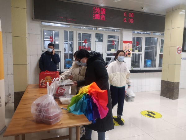 7天自我健康监测仍不能在食堂吃饭。吃饭时间到了,教职工一楼食堂里,13个工会小组成员陆续在窗口领取所在工会小组人员的盒饭,由他们分发给不同岗位上的每位教职员工。学生食堂,学生们在窗口排队,按照自己的口味喜好买饭菜,三三两两,相约着买好饭菜打包回到宿舍吃。八号学生楼依然实行封闭管理,饭食由专人送进去,粉条、面条、盒饭,每天换着花样,让学生们感受“舌尖上的快乐”。