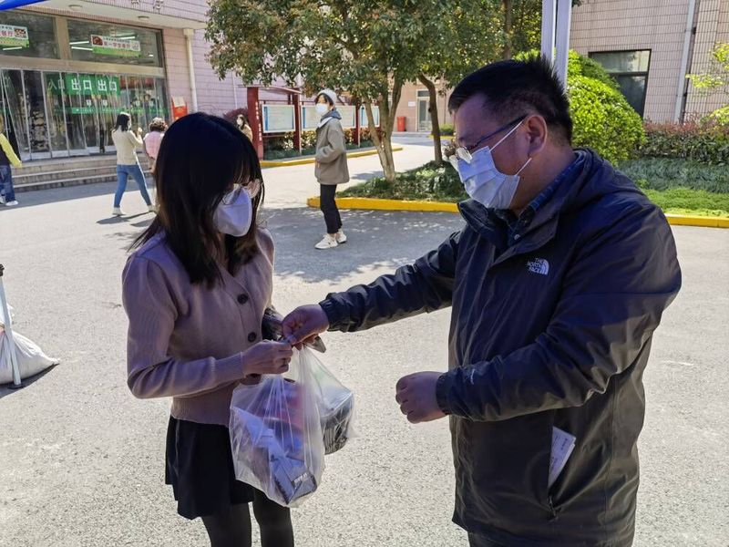 消毒、卸车、搬运、分袋……现场,副院长张江、工会主席高功辉,学工部、部分学生工作负责人、各系值班教师、辅导员和志愿者代表齐上阵,将慰问食品发放到同学手中,表达着学校的关心和慰问。老师们仔细询问了同学们学习、生活状况以及实际需求,叮嘱学生自觉遵守疫情防控期间学生管理有关规定,做好自我防护,保证合理作息,和父母保持密切联系,同心战疫、共克时艰,共迎春暖花开。