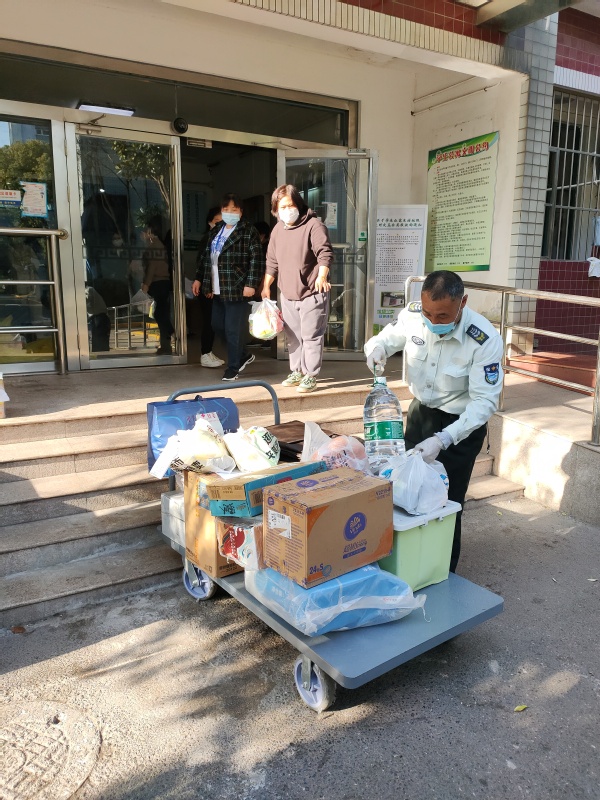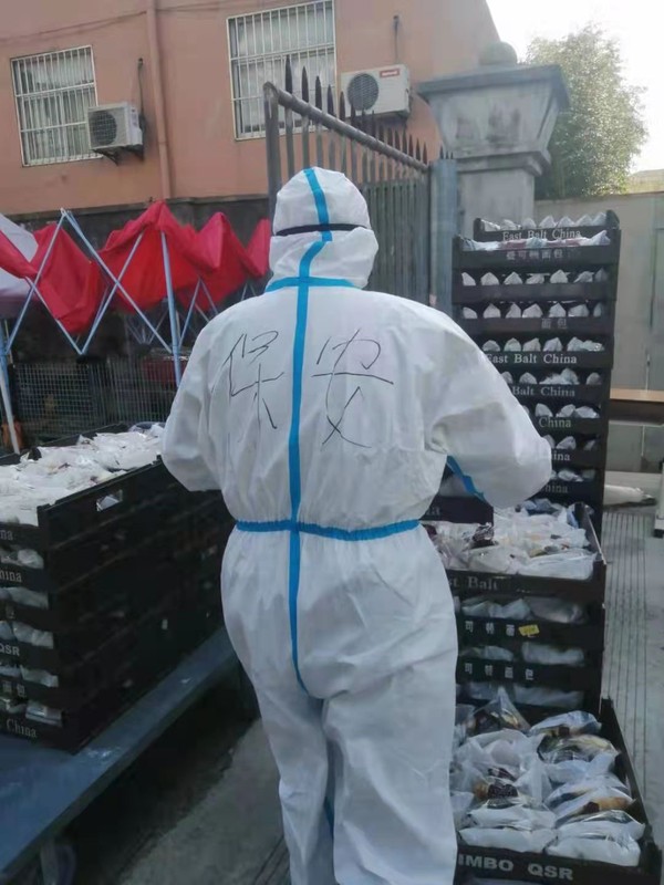3月中旬的天气,阳光格外给力,日均气温多在20℃以上,防护服密不透风,化身“大白”的安保队员们各个汗如雨下,在防疫物资紧张的当下,他们舍不得多换,一穿就是一个班,再脱下时,身上已散发阵阵浓郁的汗臭味。由于情况紧急,队员们都没来得及准备个人生活物品,换洗衣物成了大难题,队员们平均年龄35岁,均是外省市来沪打工人员,多数无亲属在沪,衣物外来补给几乎不可能,于是,保安队长请其爱人帮忙,从队员们的居所带了一部分衣物送至学校,他们互相拼拼凑凑,熬过了头三天,到第四天开始,队员们已无衣物可穿,大白衣服便是他们的贴身衣服了,但是队员们无怨无悔,总是笑着和每一位碰面的教职员工问好。在被问及为什么不向学校求助时,受访队员哽咽了,他们说:“当时,安排检测点、发放物资……学校所有人都很忙碌,我们怎么好意思再麻烦他们呢?”在最初的几天,他们没有向学校提出一些生活物资需求,工会、保卫部门在得知基本情况后,为大家及时解决了部分基本生活物资。