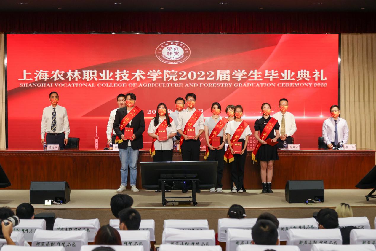 党委副书记陈谊宣读《上海农林职业技术学院2022年度优秀毕业生和2022年度上海市优秀毕业生表彰决定》,副院长张江宣读《上海农林职业技术学院关于准予2022届毕业生毕业的决定》,党政领导现场颁发上海市高校优秀毕业生、学院优秀毕业生和学生毕业证书。
