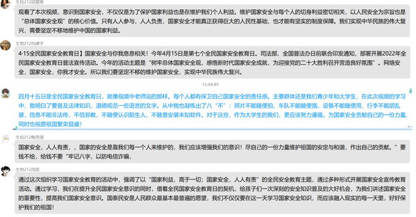 同时,利用大学生在线视频号组织师生收看“千万师生同上一堂国家安全教育课”主题公开课,组织了1次校园安全专项检查,加强了校园疫情防控期间校门24小时值守力量和管控措施。
