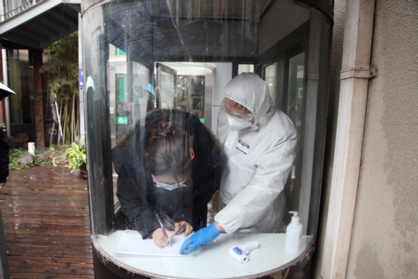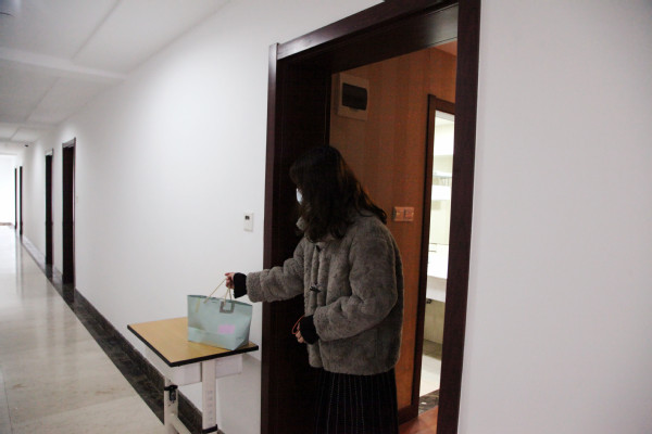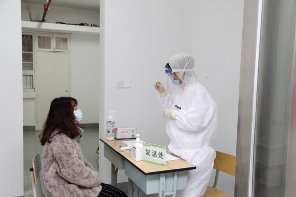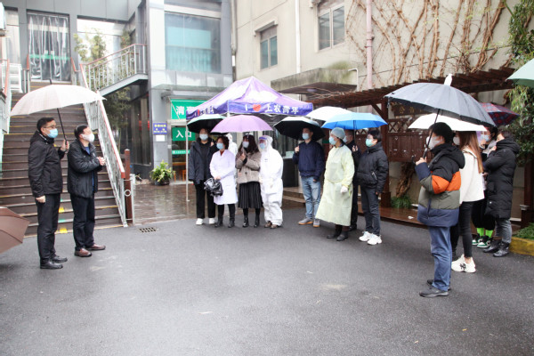 魏华院长宣布演练开始:演练围绕学生公寓由1名学生出现发热、干咳症状和体温超过37.3℃的突发情况展开。防控办接到此情况后立刻发出指令,启动学院新型冠状病毒肺炎疫情防控应急处置预案。学院新型冠状病毒肺炎疫情应急处置小组迅速响应,校医务人员穿戴防护装备赶赴临时留观室进行两次测温(用“腋下水银温度计”等测温设备),并给予送医就诊意见,并由辅导员陪同(戴好口罩并保持1米距离)该生迅速送往定点医院松江区中心医院发热门诊就诊。随后,后勤保洁人员对临时留观室等场所开展消杀处理。在等待医院报告期间的场景演练中,模拟了该发热病例学生返回学校,直接安排至校内集中隔离观察点居住,并对入住隔离以及无接触送餐等流程的规范应急处置。